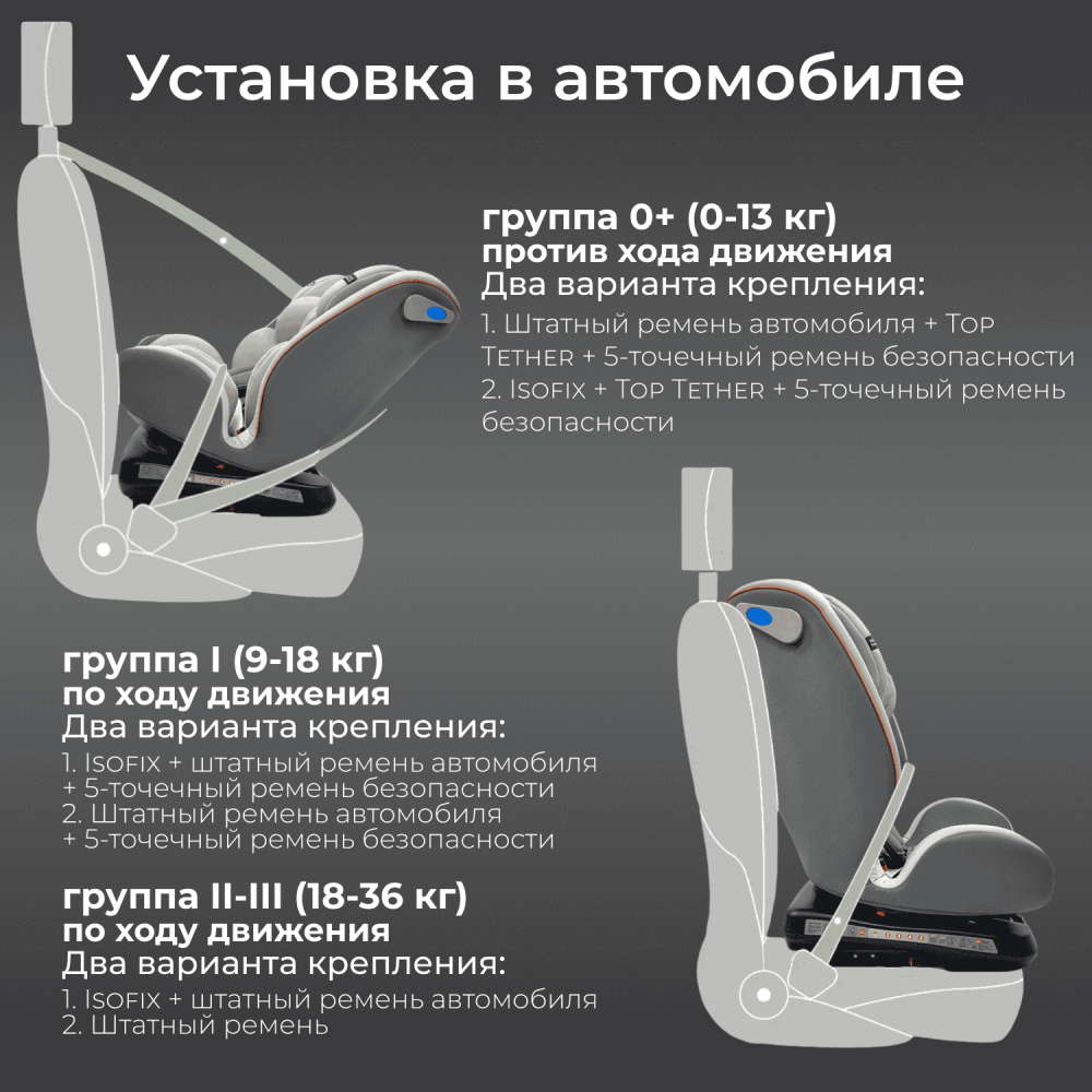 - Крепления: Isofix + Top Tether, либо штатный ремень автомобиля