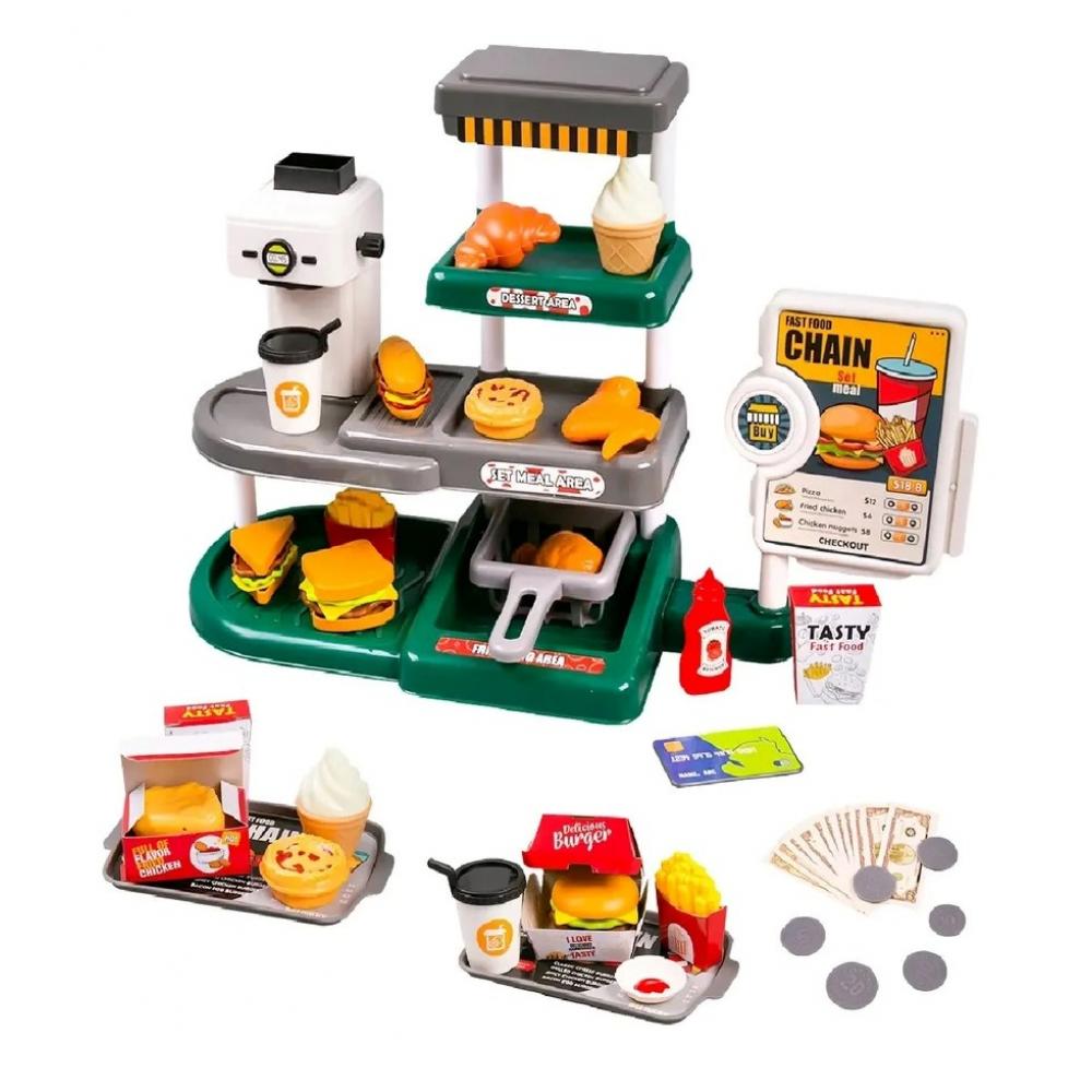 Детский игровой набор фастфуд Бургер - закусочная предназначен для создания домашнего кафе или магазиначика с фастфудом и закусками. В комплекте есть игрушечный прилавок, который позволяет ребенку почувствовать себя продавцом, официантом или поваром в небольшом ресторане. Игра способствует развитию навыков обслуживания и общения, а также помогает мальчикам и девочкам погрузиться в увлекательный мир игры с супермаркетом и мини - кафе.