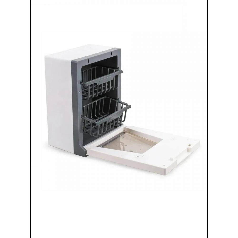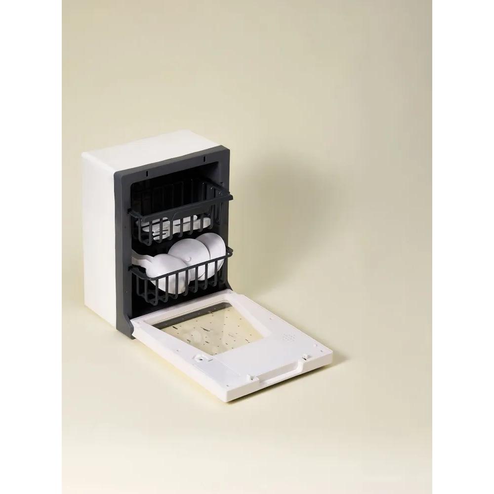 - На табло идет обратный отсчет до окончания работы. Машинка работает от 2 батареек АА ( не входят в комплект). Отсек для батареек находится в дверце посудомоечной машинки.