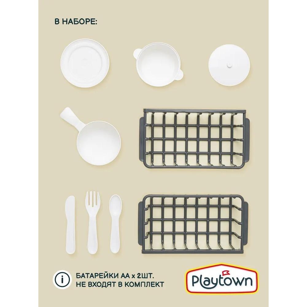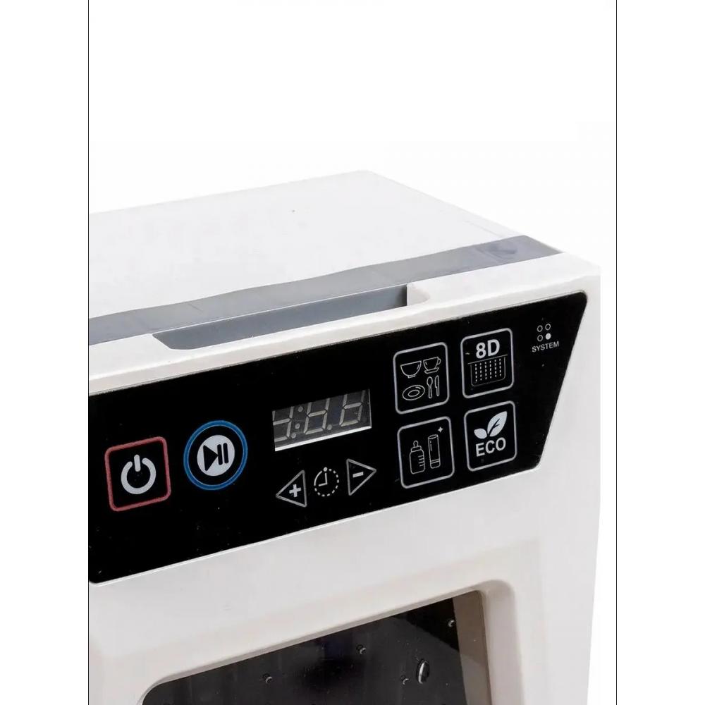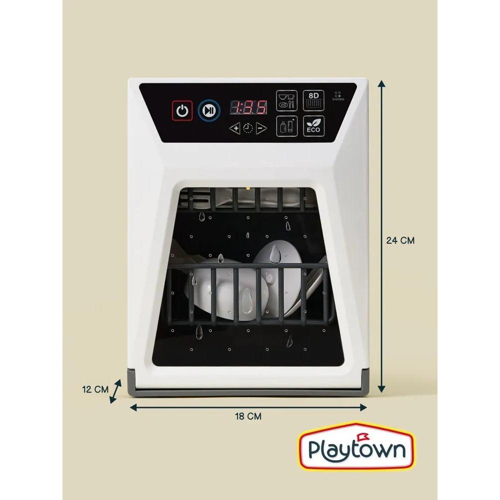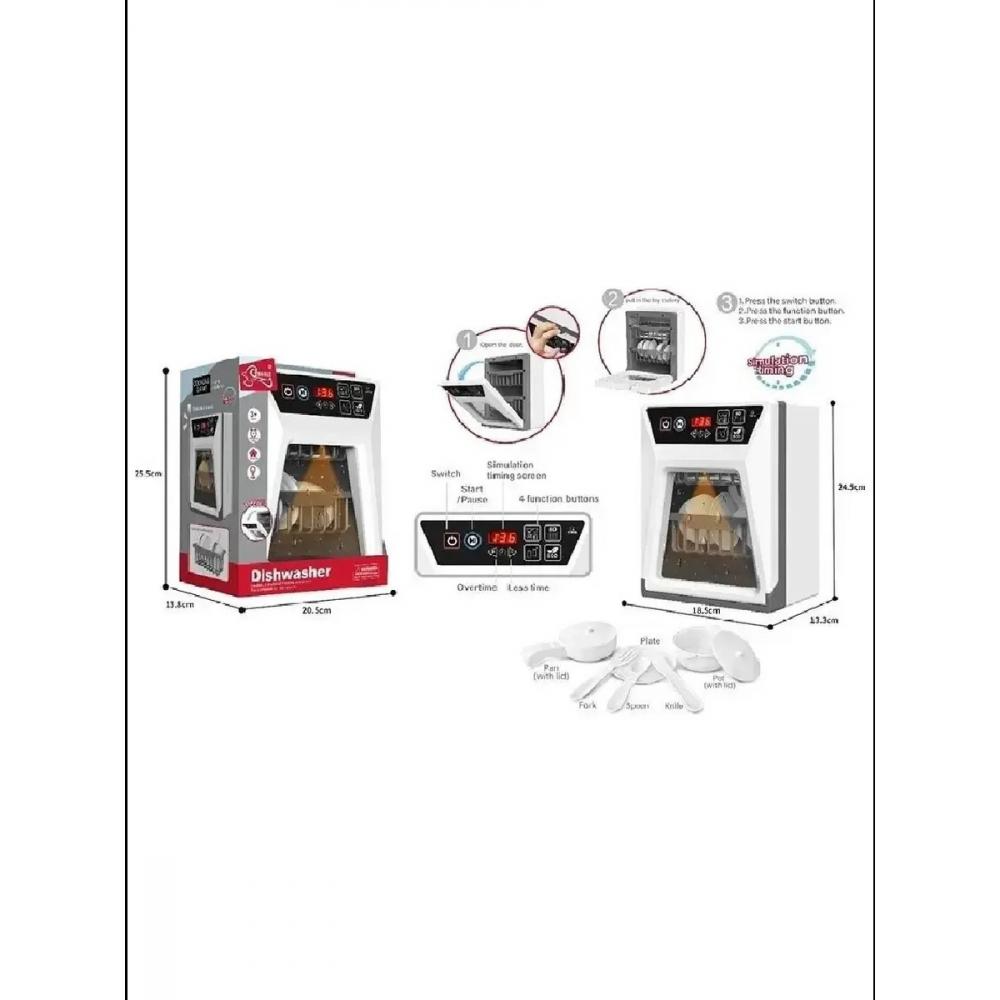 - Детская посудомоечная машинка имитирует разные режимы работы издавая соответствующие звуки (помывка, сушка); отсек внутри подсвечивается; можно увеличить и уменьшить время работы, задав время на табло; капли на стекле не двигаются.