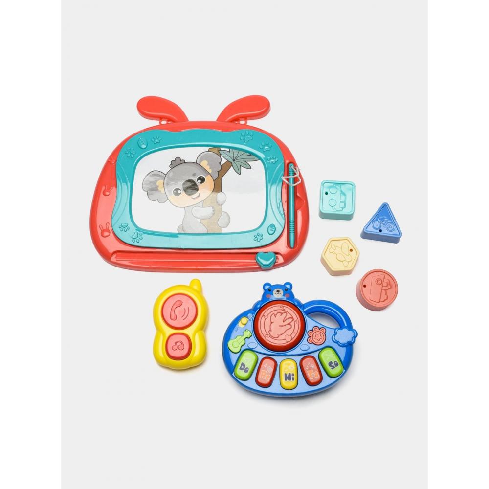 - На игровой панели центра расположено множество развивающих элементов: шестеренки, сортер с фигурами, формы с ягодками, фруктами, цифрами. Съемные игрушки: телефончик-погремушка, пианино, доска для рисования.