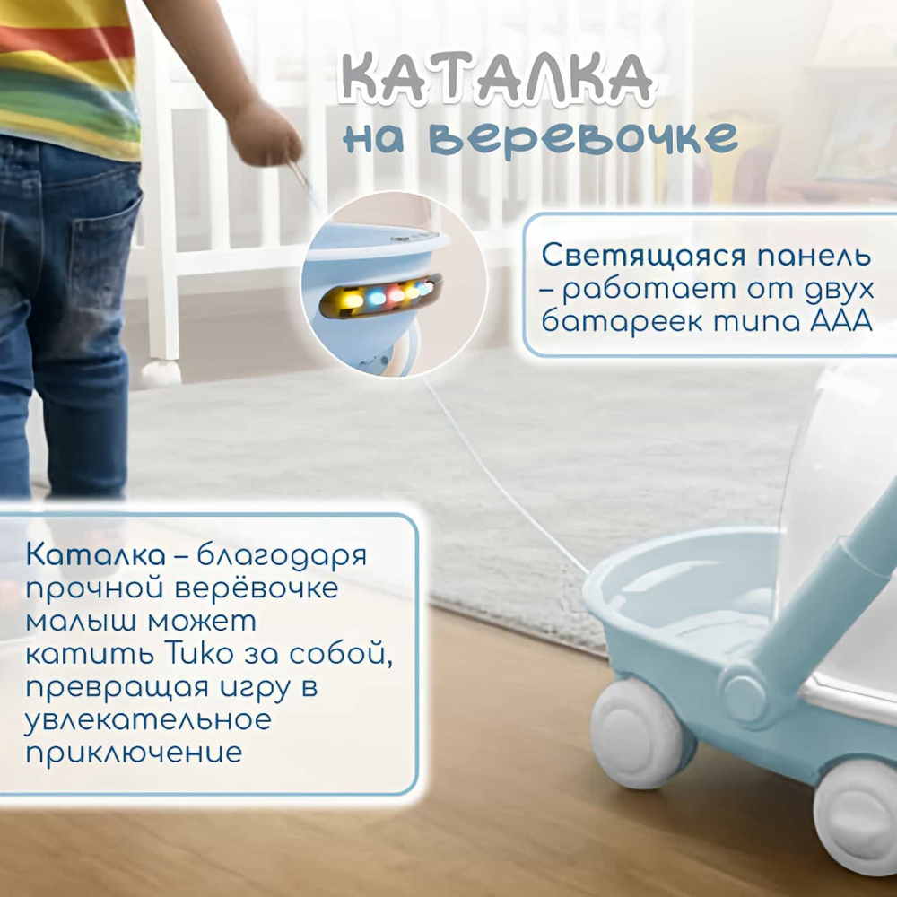 - Каталка – малыш может катить Tuko за собой с помощью прочной верёвочки.