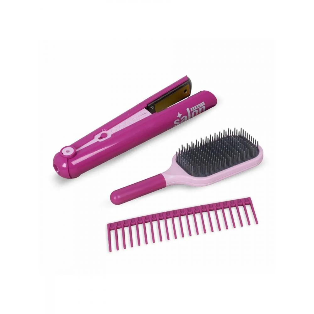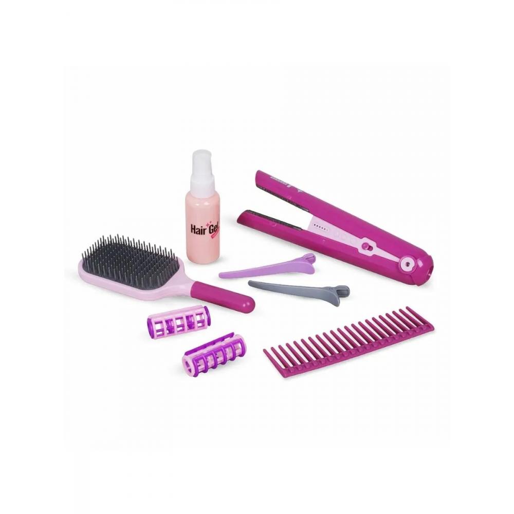 - Игровой набор включает в себя 14 предметов: детский фен на батарейках, 2 насадки на фен, ножницы 2 шт, 2 расчески, заколки 2шт, бигуди 2 шт, флакончик спрей с крышкой, выпрямитель для волос, подставка для выпрямителя. Фен работает от 3-х батареек типа "ААА" (в комплект не входят).