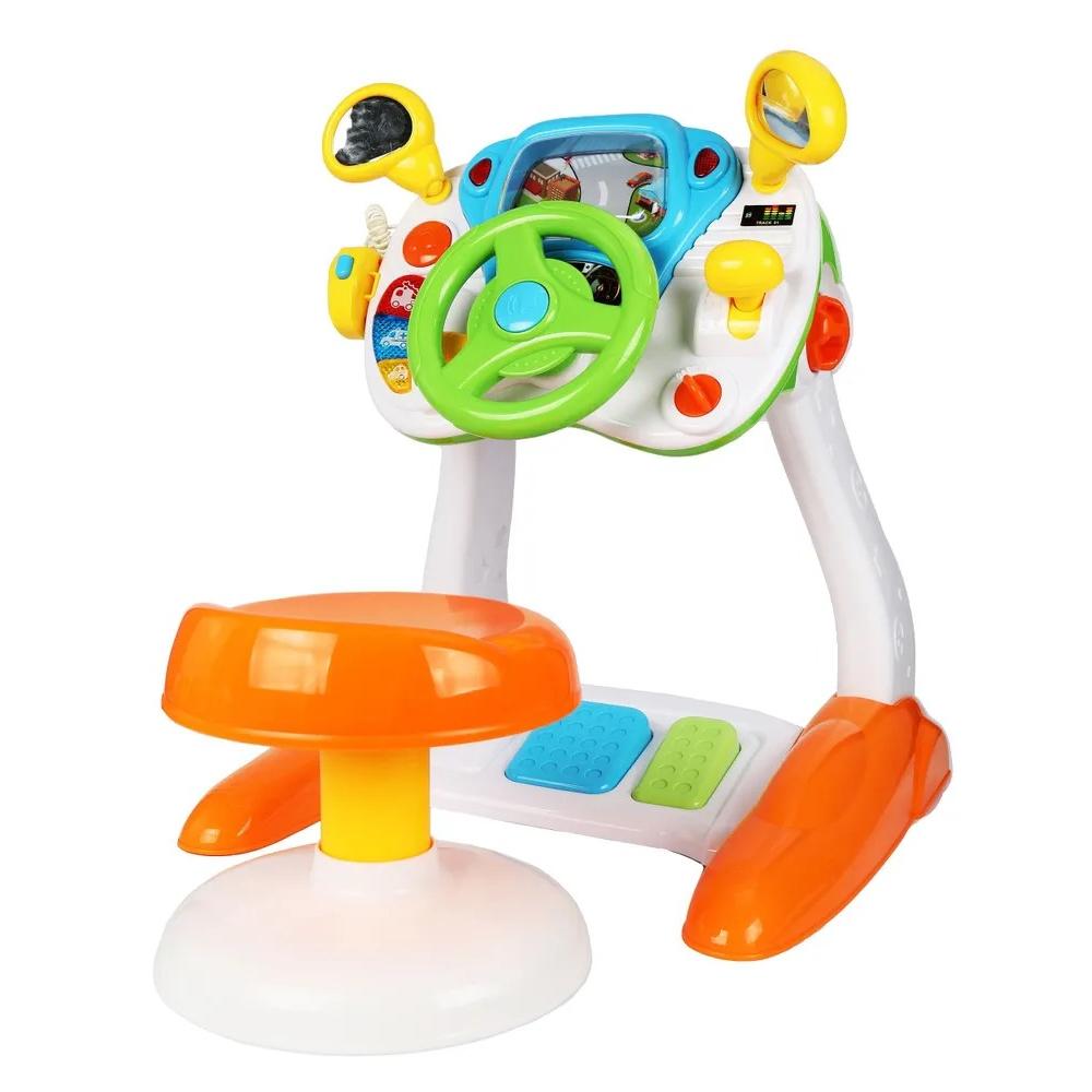 Игрушка состоит из двух частей: сиденья и панели управления. На панели имеется все, чтобы малыш почувствовал себя настоящим водителем: руль, коробка передач, педали газа и тормоза и экран с машинкой - лобовое стекло. У игрушки есть звуковые и световые эффекты: реалистичные звуки вождения (торможение, ускорение), три аварийные сирены, мигающие огоньки, музыка и другие забавные функции.