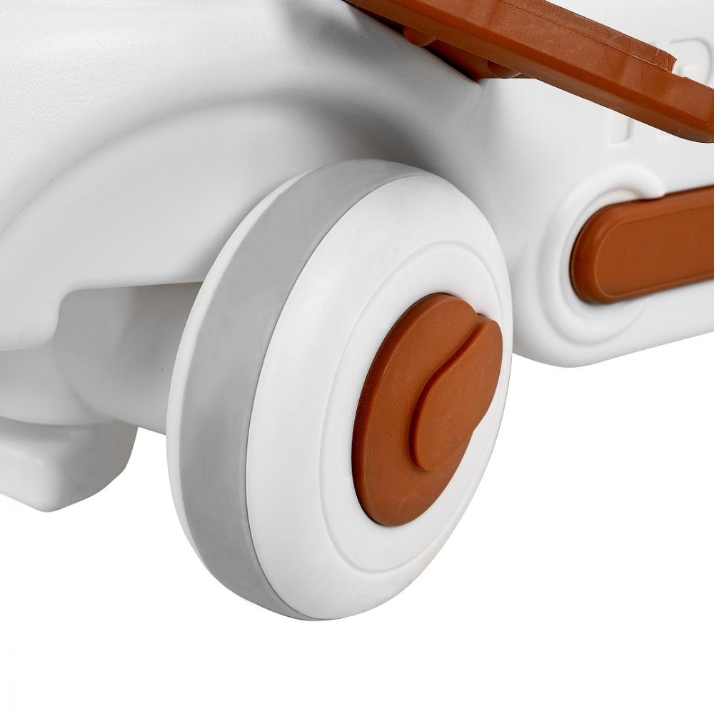 Прочный корпус обеспечивает конструкции надежность и может выдержать ребенка с максимальным весом до 30 кг. Игрушка имеет небольшой собственный вес и компактные размеры 76*41*73 см (общий с толкателем).