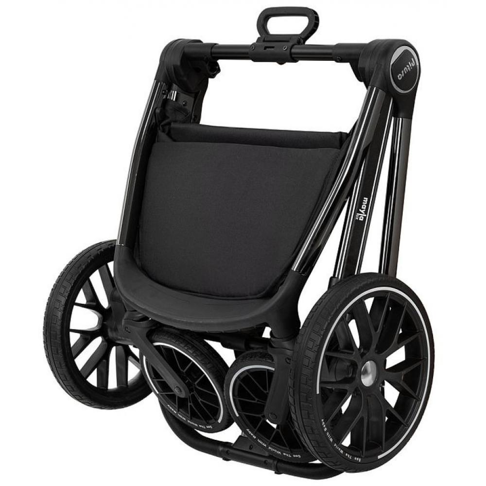 - Рама из облегченного алюминия с покрытием Black Chrome имеет повышенную износостойкость и компактно складывается по типу "книжки" вместе с прогулочным блоком.