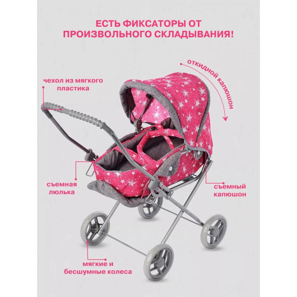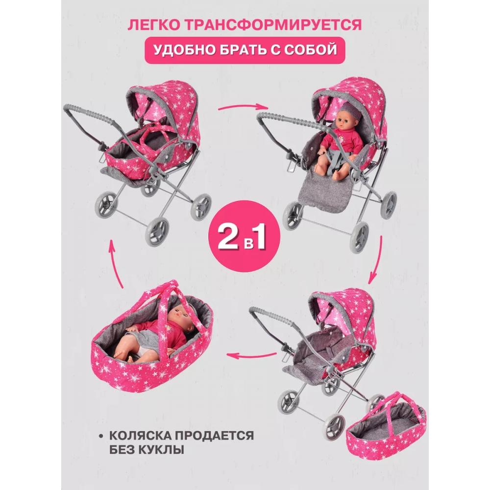 Детская игрушечная коляска для кукол оборудована люлькой и переноской. Размеры люльки 46 х 20 см. Наклон спинки и части под ножками куклы регулируется, благодаря чему кукла в коляске иможет как лежать, так и сидеть. В люльке имеется ремень безопасности для куклы. Капюшон люльки регулируется. Так же, при необходимости, его можно снять. Детская коляска для кукол имеет 4 одинарных колеса. Колеса мягкие и бесшумные, диаметром 13 см. Коляска оборудована дополнительными фиксаторами от самопроизвольного складывания. Высота от пола до ручки коляски 60 см. На ручке коляски - чехол из мягкого пластика, что снижает риск травмирования ребенка. Все текстильные части коляски можно отстегнуть от металлического каркаса, что дает возможность постирать люльку и капюшон. Коляску можно сложить, для удобной траспортировки или хранения.