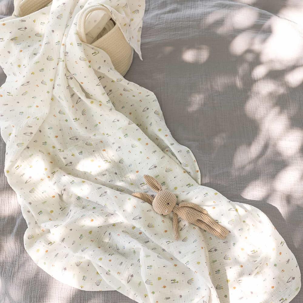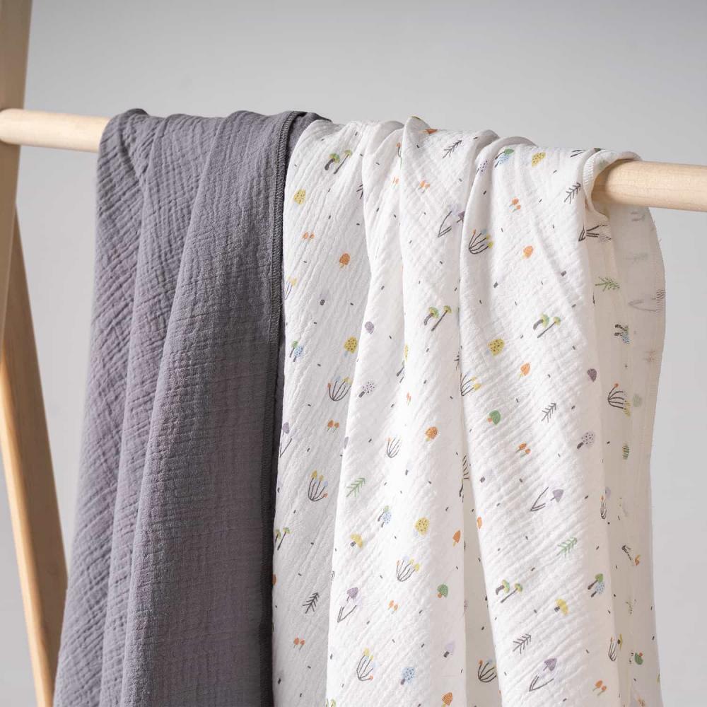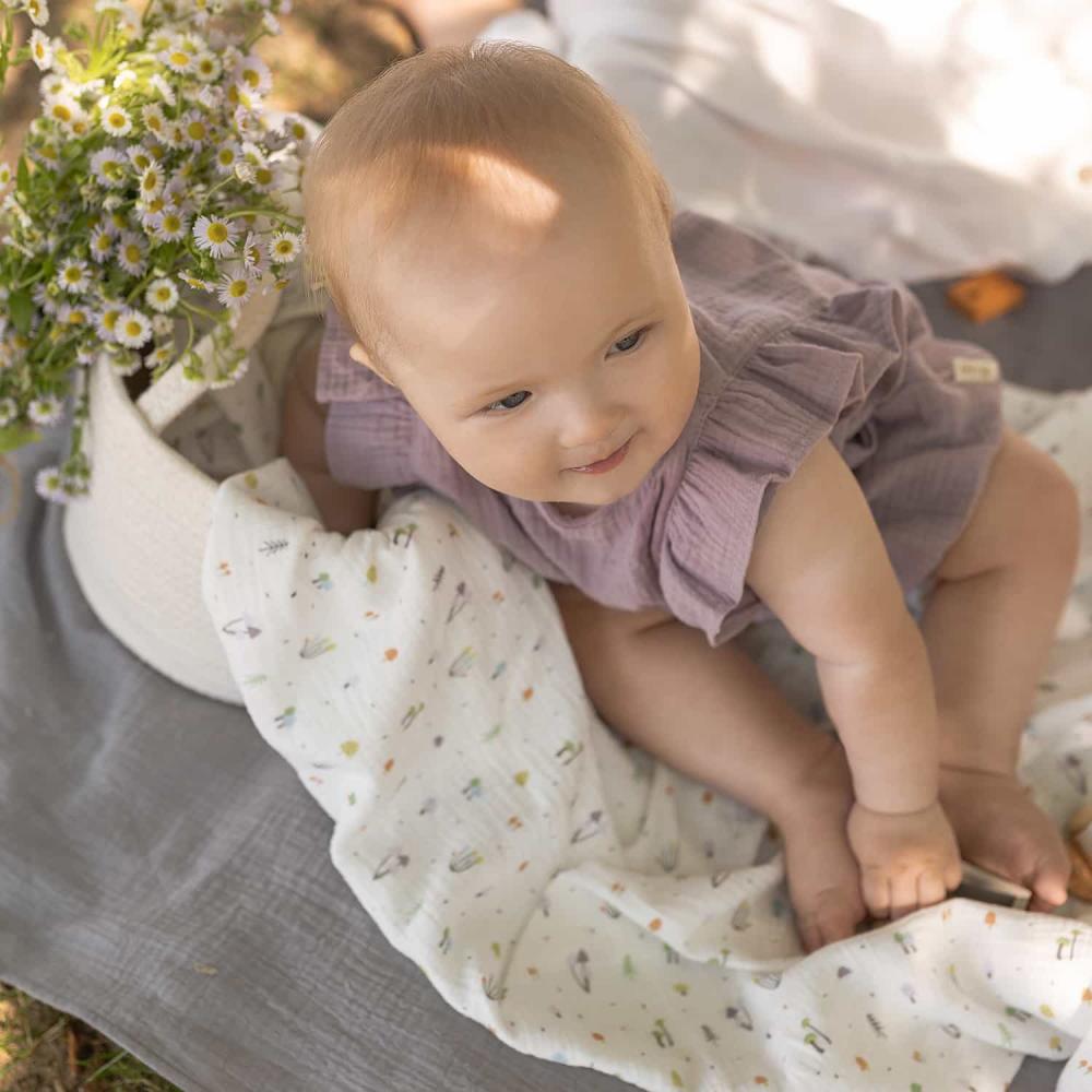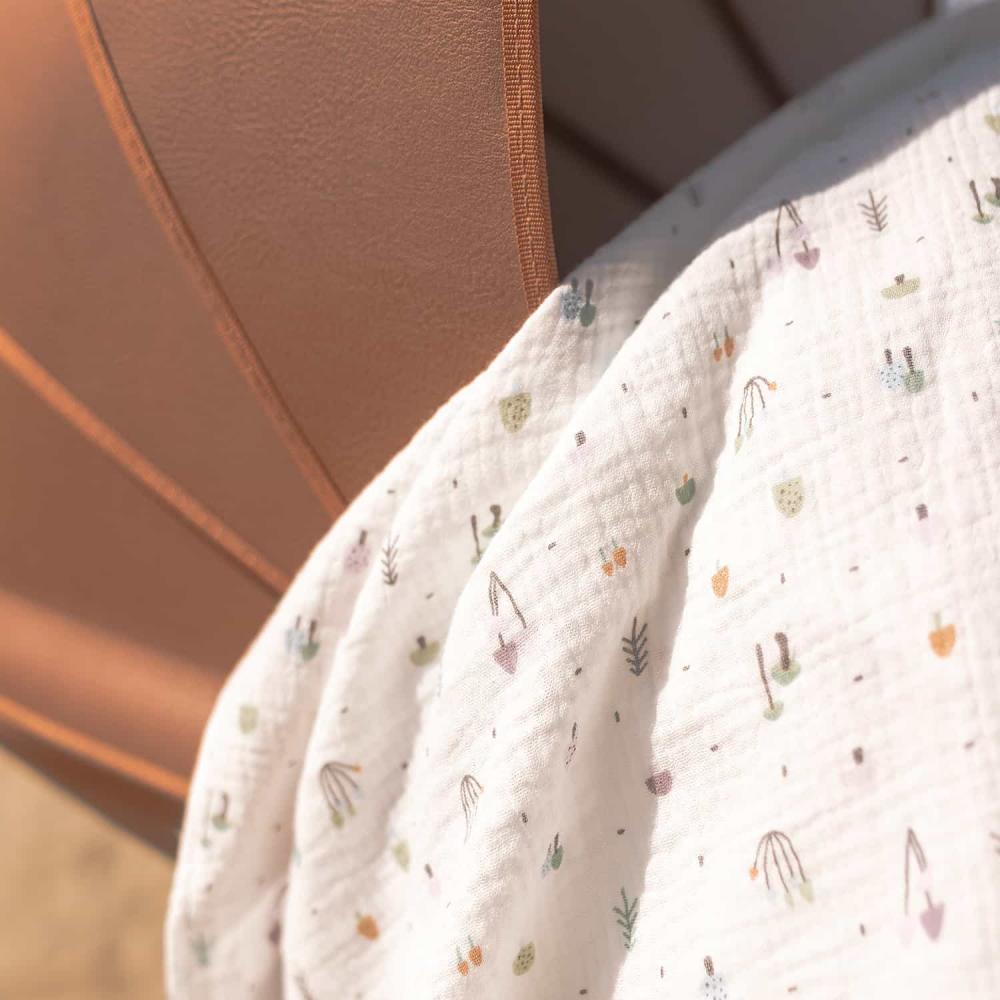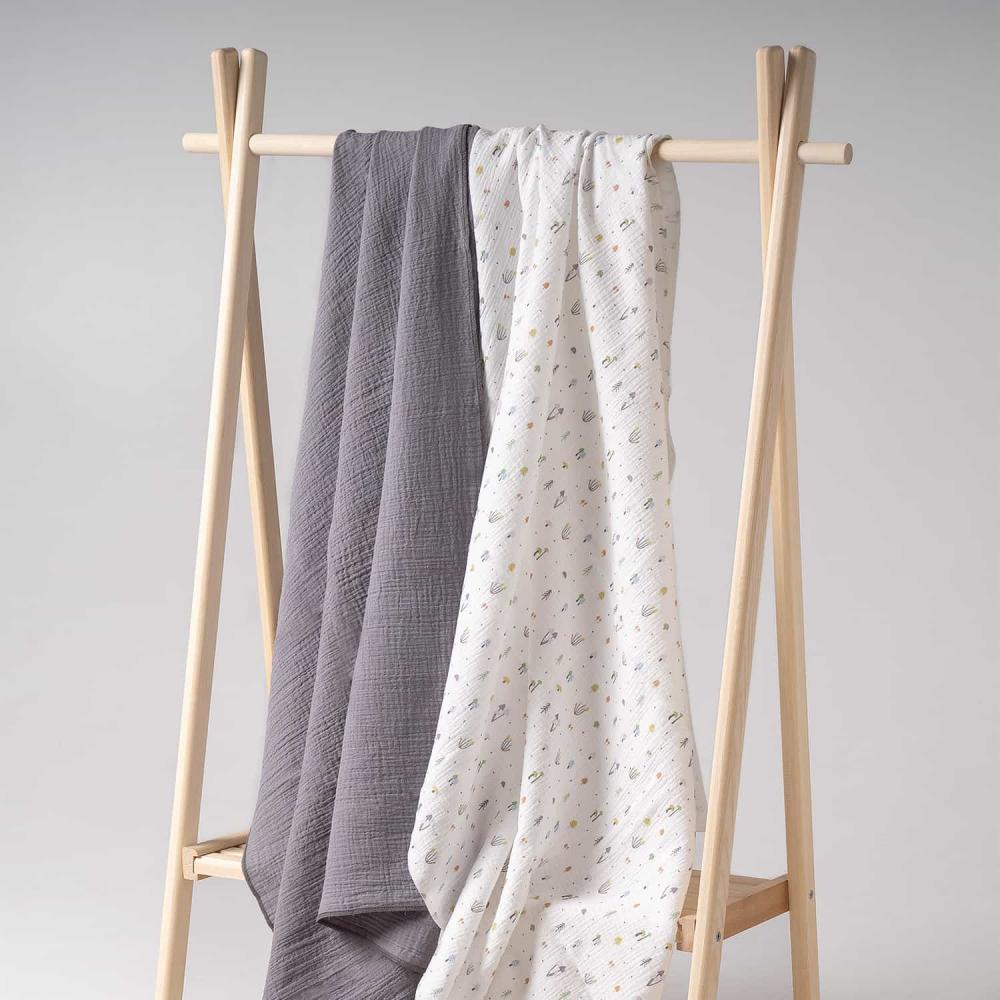 Специальная безопасная технология окрашивания ткани позволяет сохранить стойкость цвета и яркость рисунка даже после многократных стирок. Летом пеленку из муслина часто используют вместо марли, чтобы скрыть от ветра, прямых солнечных лучей, взглядов окружающих или просто от внешнего мира спящего малыша в прогулочной коляске.