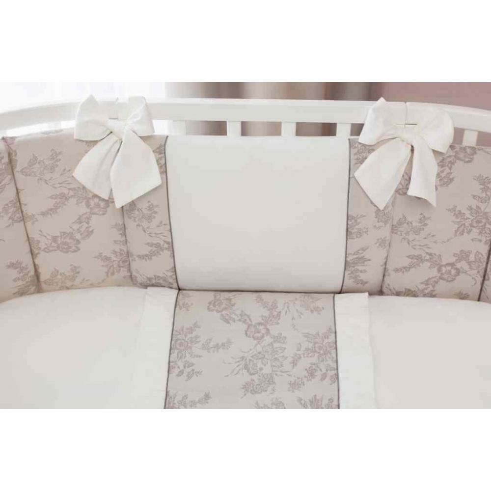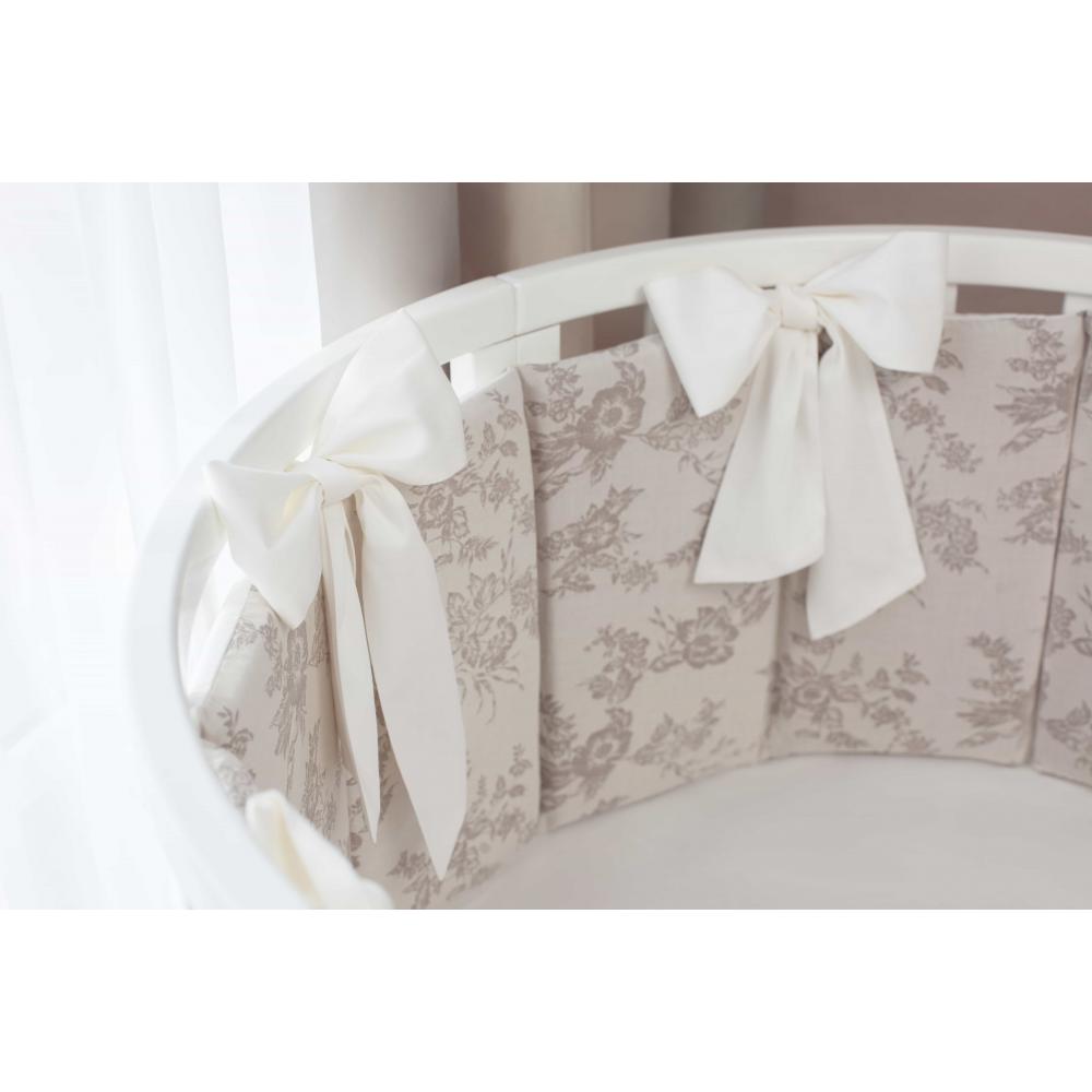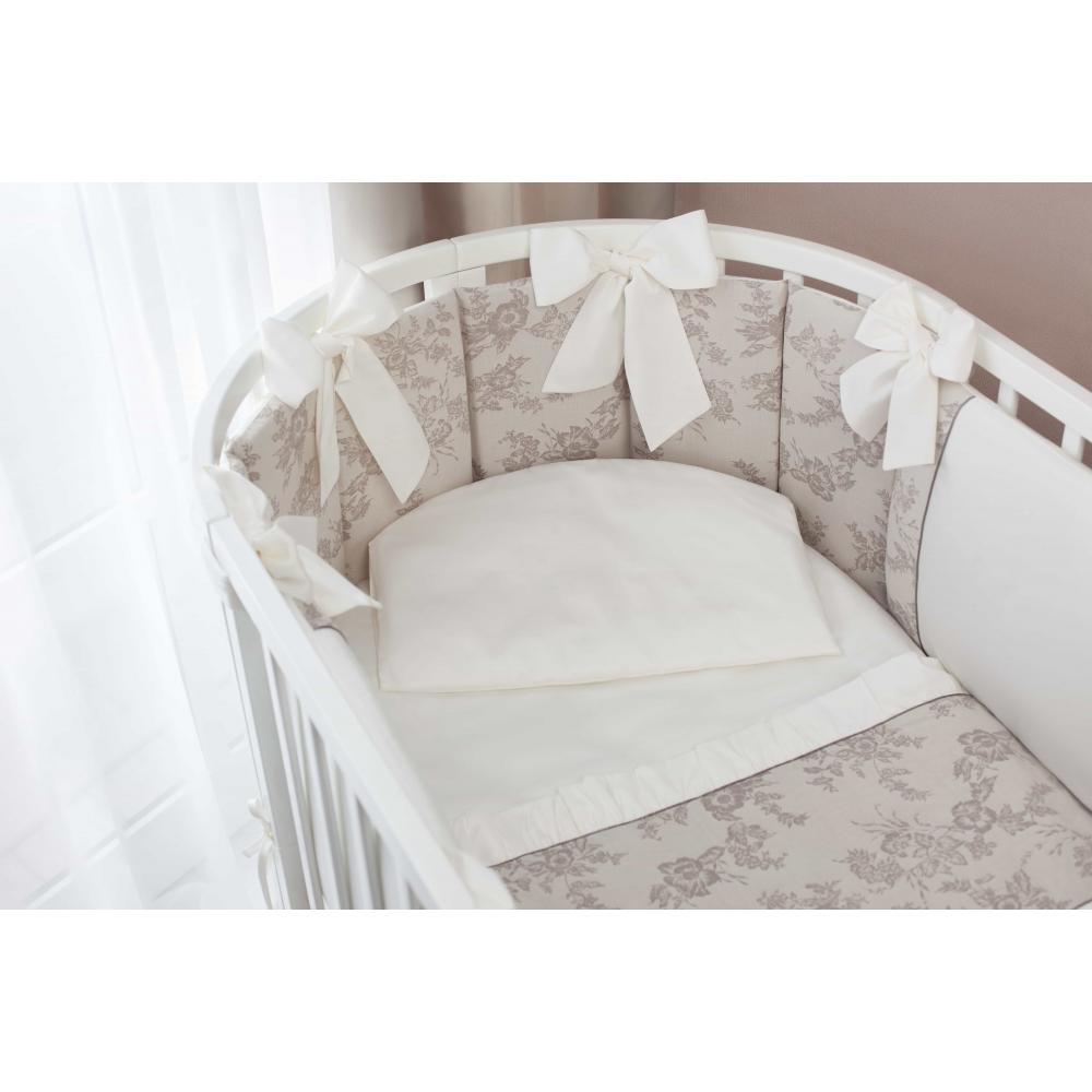 Две простыни разных размеров и составной бампер, допускающий варианты сочетания частей, позволяют использовать комплект в кровати-трансформере. Специально для круглых и овальных кроваток разработана эксклюзивная закругленная форма подушки и одеяла.