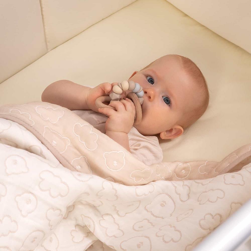 - Стильное и практичное решение — двусторонний дизайн пледа. Изящный узор понравится и родителям, и малышу.