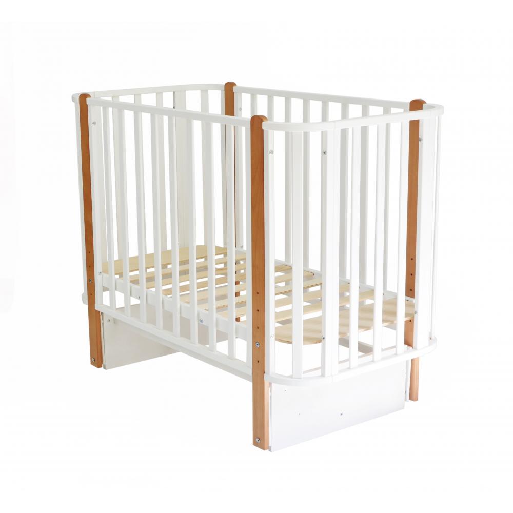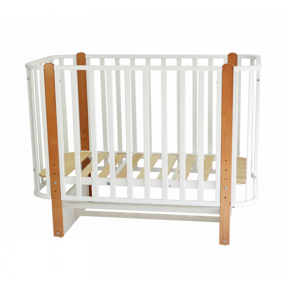 Кроватка имеет съемное переднее ограждение, 5 уровней ложа, цвет белый+бук с маятником (в комплекте продольный и поперечный). Регулировка уровней дна в 5 положениях. Реечное основание. Съемная передняя боковина для возможности приставить кроватки к родительской и организации совместного сна. Можете полностью снять переднюю стенку и прикрепить кроватку к вашей родительской кровати с помощью специального ремня, входящего в комплект.