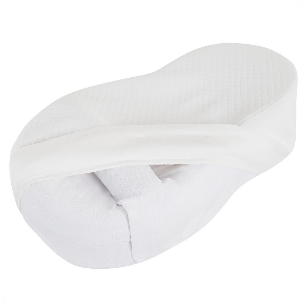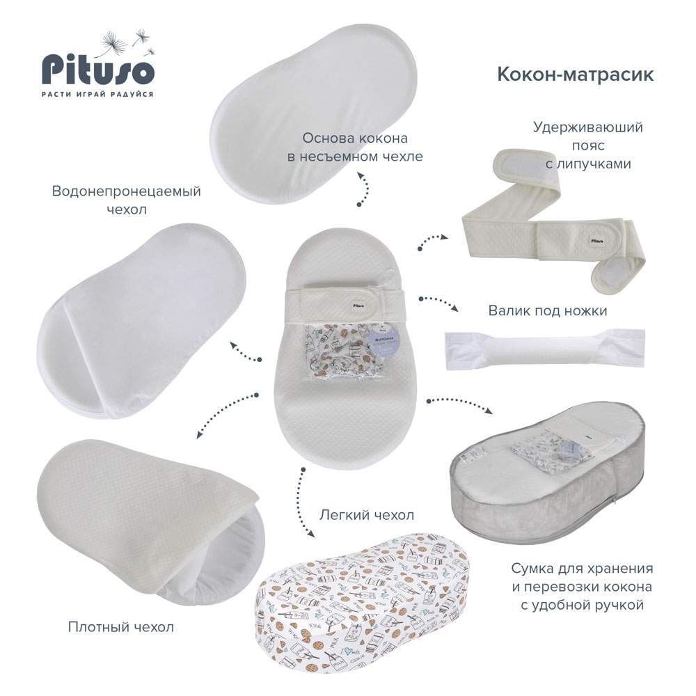 Основание колыбели-кокона из вязкого-эластичного пенополиуретана (пена с эффектом памяти); Два съемных чехла на резинке – плотный и трикотажный; Непромокаемый чехол на молнии; Валик под ножки; Пояс с липучками; Сумка-переноска.