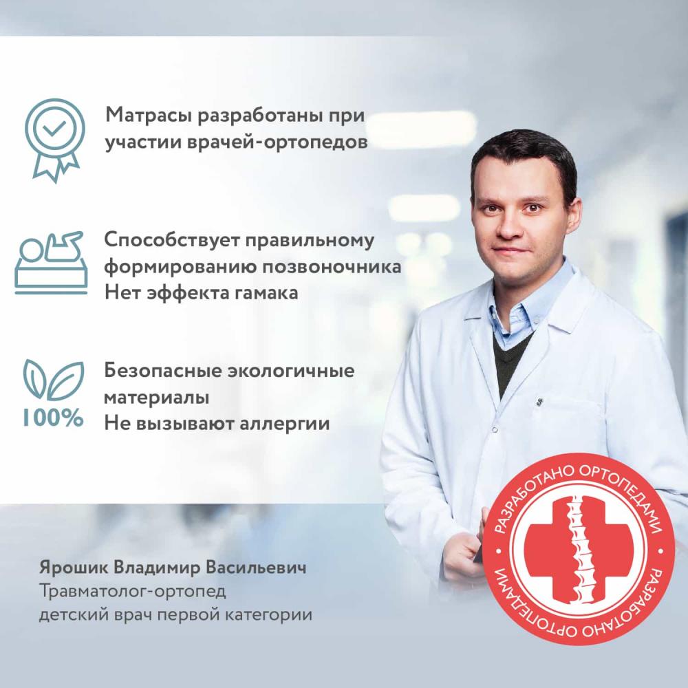 Модель на основе натуральной латексированной кокосовой койры, одного из самых популярных наполнителей для детских матрасов. Кокосовые волокна упругие и плотные, они обеспечивают надежную поддержку позвоночника ребенка. При этом кокосовая койра абсолютно безопасна даже для новорожденных (есть соответсвующий международный сертификат качества).