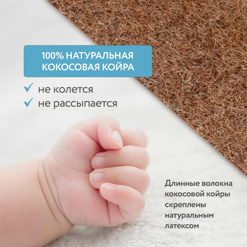 Универсальный детский матрасик длялюльки. Жесткая и упругая кокосовая койра, которая лежит в основе матраса, будет способствовать формированию правильной осанки младенца. Натуральный чехол из 100% хлопка сделает матрас более комфортным и теплым. В зимнее время на таком матрасе будет удобно катать малыша на санках.