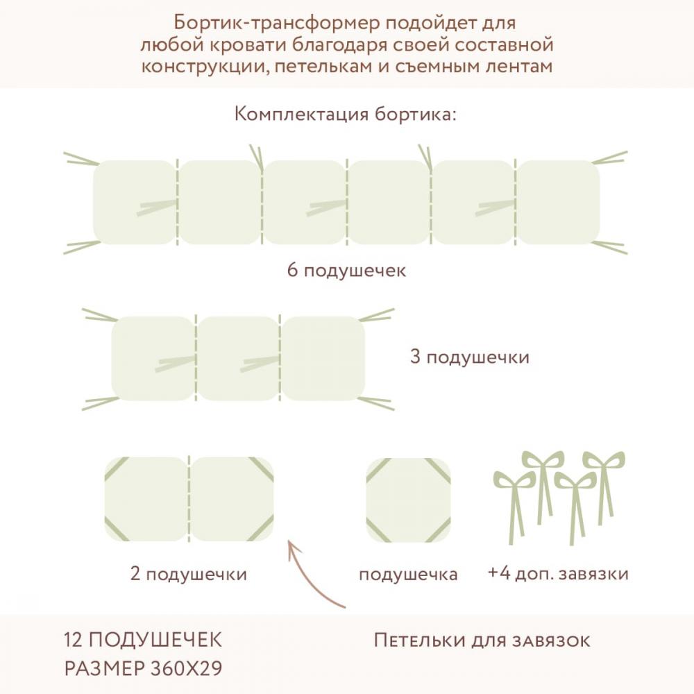 Эта модель бортиков состоит из 4 отдельных частей: полуборта из шести подушечек, одной отдельной подушечки и по одной части из двух и трех подушечек. Элементы крепятся к кроватке завязками, что облегчает их использование. Вы можете использовать столько частей, сколько захотите, а отдельную подушечку с рюшами можно использовать не только как защиту, но и как декоративный элемент.