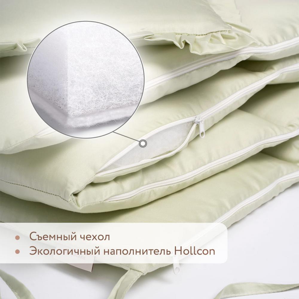 Сатиновая премиальная ткань, из которой сделаны бортики, хорошо разглаживается после стирки. Благодаря особому способу переплетения хлопковых нитей, материал гладкий, как шелк. Сочетание натурального хлопка и воздушного гипоаллергенного наполнителя Холлкон обеспечивает еще одно полезное свойство: подушечки хорошо пропускают воздух и поддерживают температурный баланс.