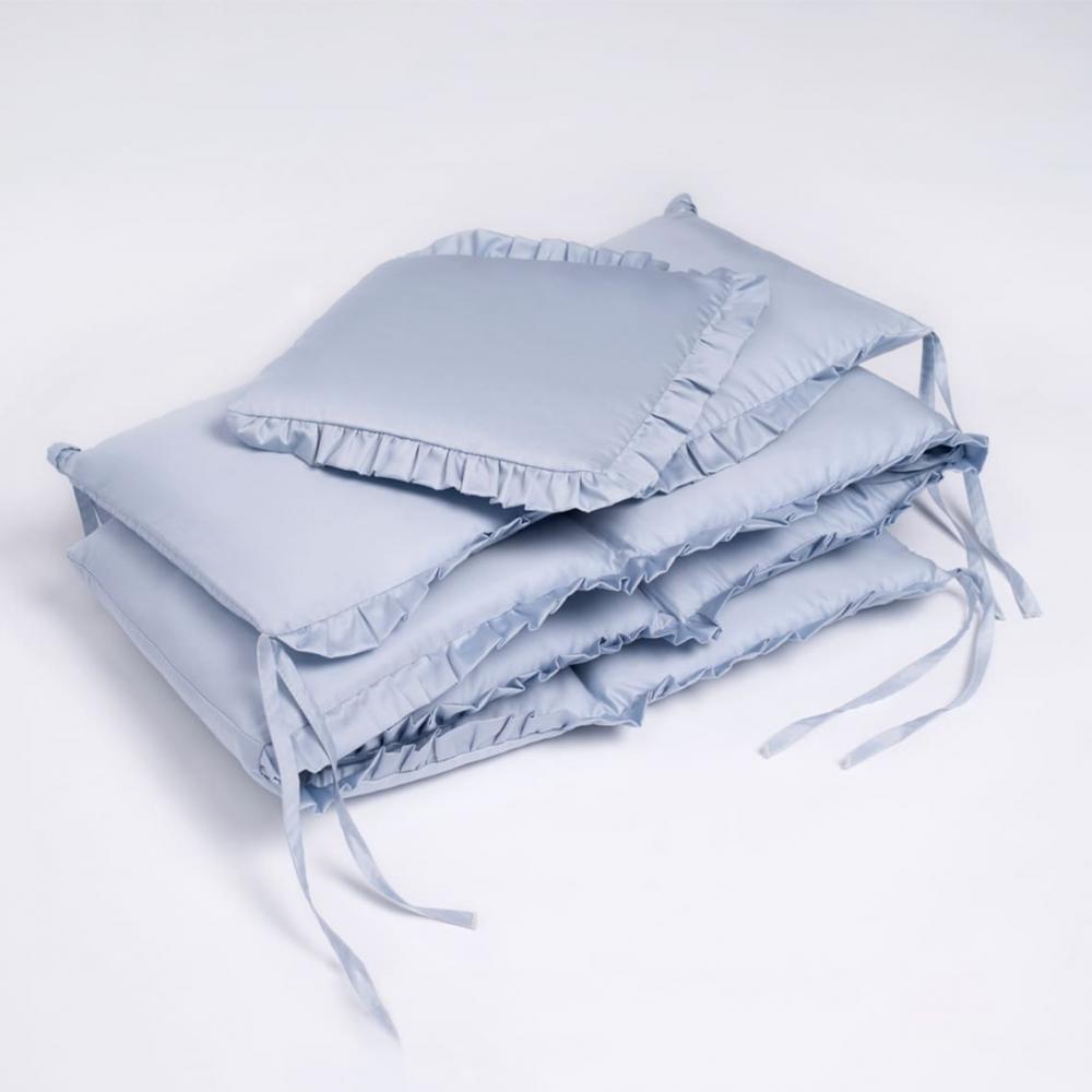 Эта модель бортиков состоит из 4 отдельных частей: полуборта из шести подушечек, одной отдельной подушечки и по одной части из двух и трех подушечек. Элементы крепятся к кроватке завязками, что облегчает их использование. Вы можете использовать столько частей, сколько захотите, а отдельную подушечку с рюшами можно использовать не только как защиту, но и как декоративный элемент.