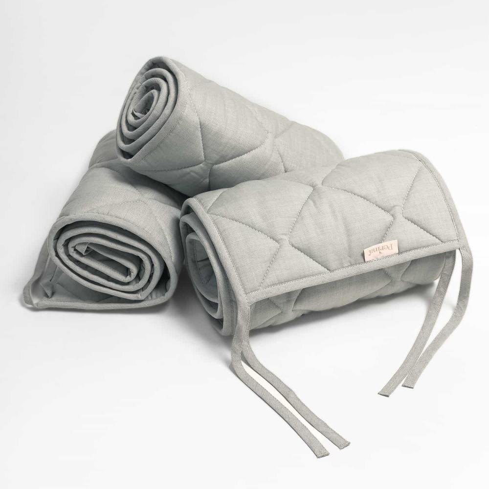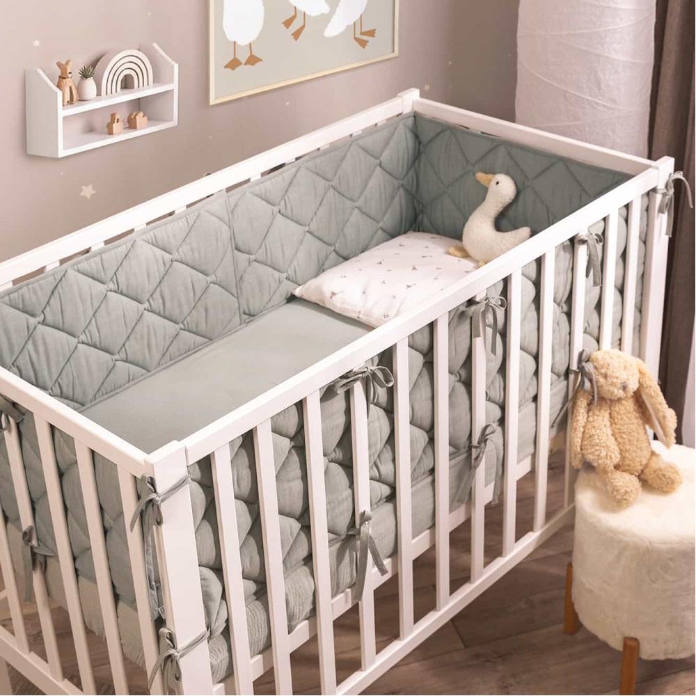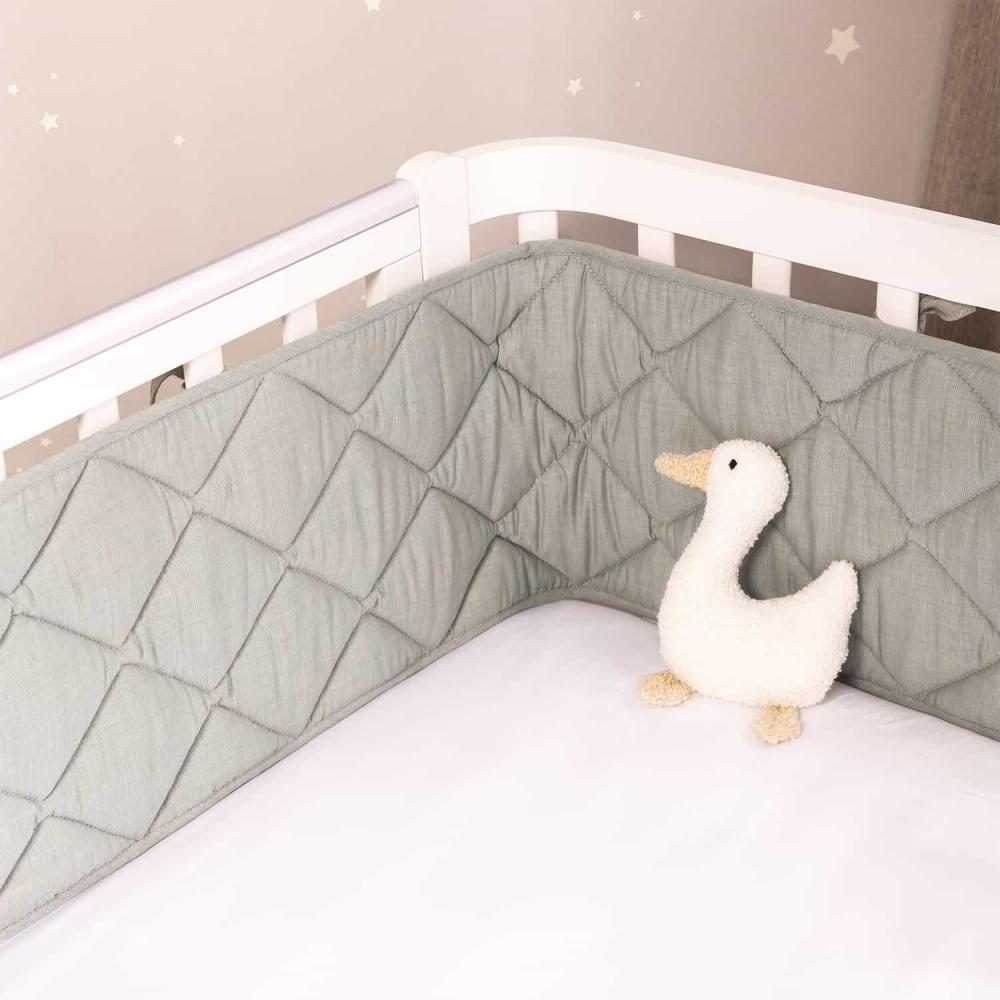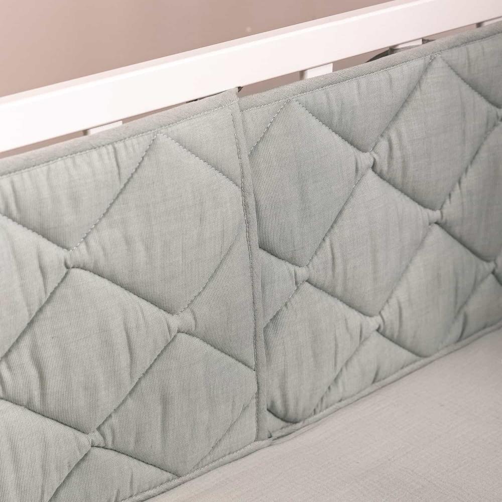 - Стеганая структура делает бортики плотными и упругими, но при этом гибкими, чтобы легко принять нужную форму по периметру кроватки.