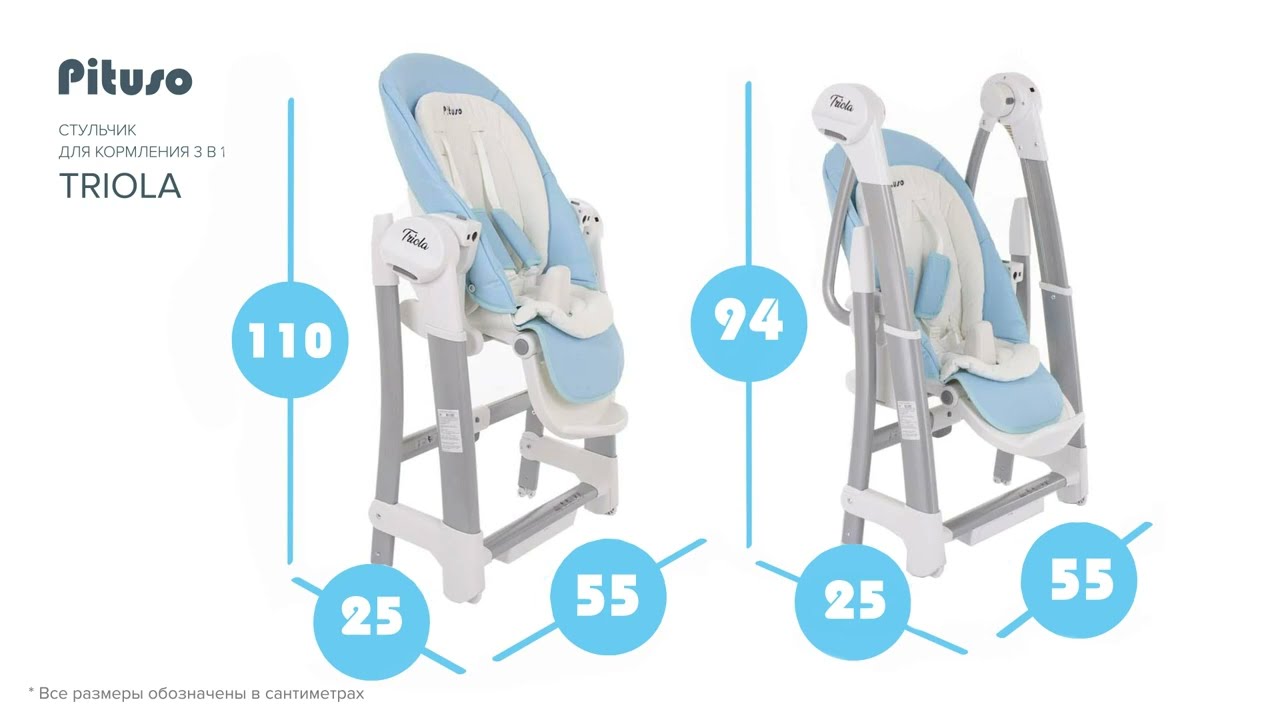 Pituso Triola - уникальный предмет мебели для ребенка с рождения, сочетающий в себе три варианта использования: электрокачели, стульчик для кормления и бустер.