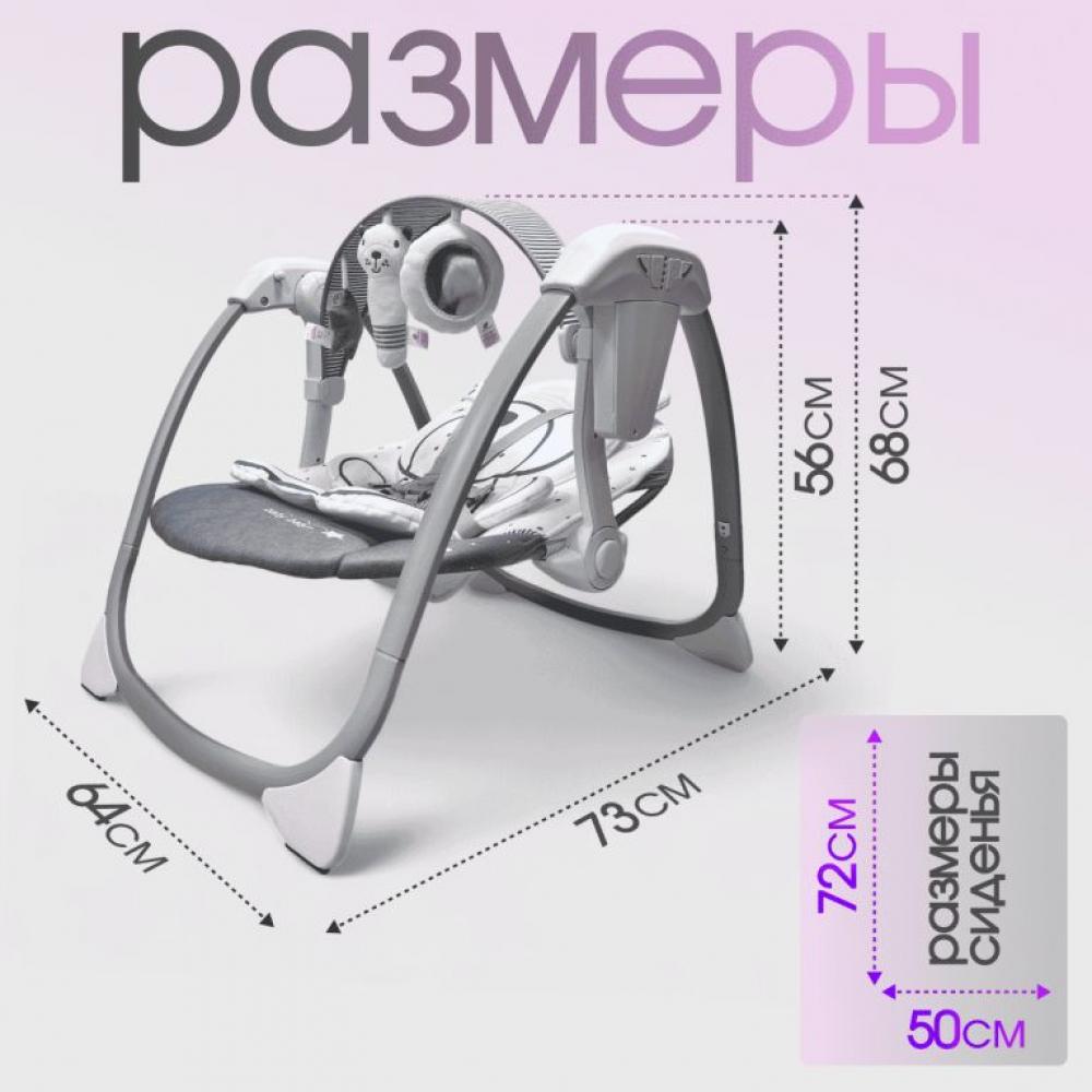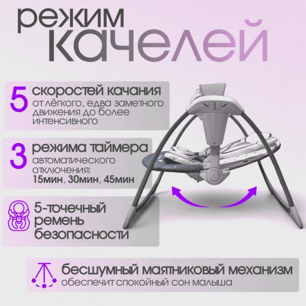 - 3 режима таймера автоматического отключения: 15, 30 и 45 минут. Родители могут выбрать, как долго качели будет работать, не беспокоясь, что малыш заснёт, а устройство продолжит качать.