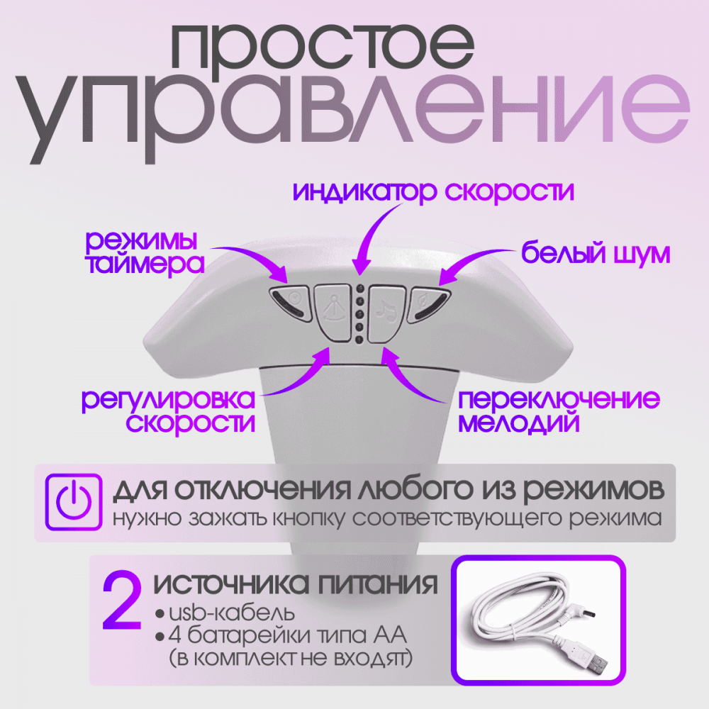 - возможность отключить музыку, оставив только укачивание, или наоборот — включить звуки без движения.
