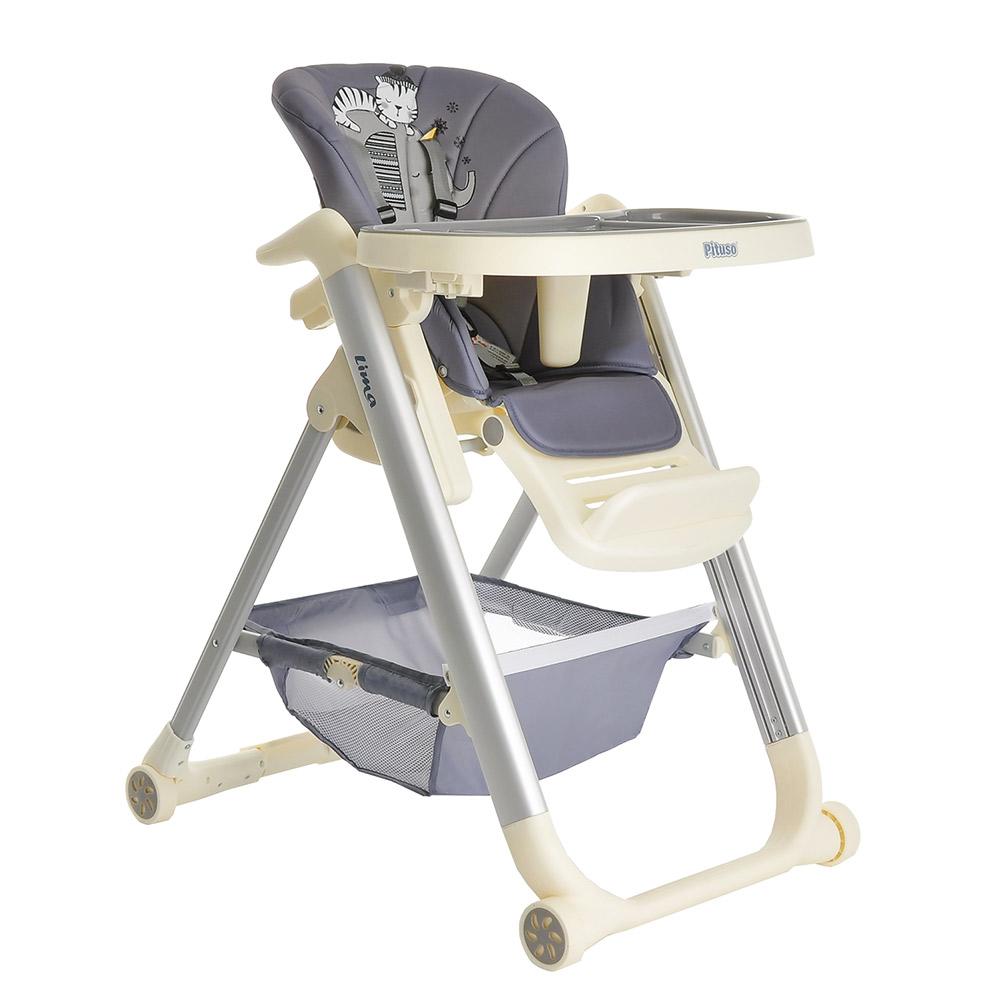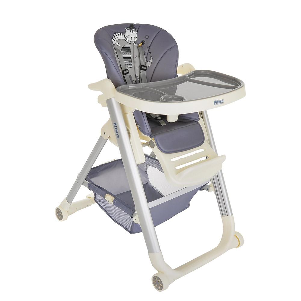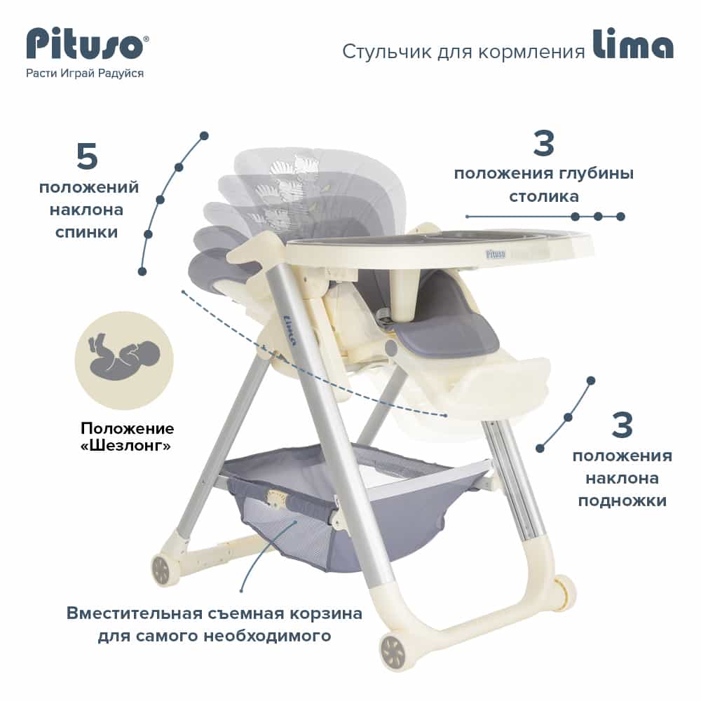 Pituso Lima – надежный, стильный и удобный стульчик для кормления. Алюминиевая рама создает устойчивость и надежность, а задние колесики оснащены педалью тормоза. Безопасная конструкция с мягким сидением из качественной экокожи, легко чистится и компактно складывается. Съемный столик подгоняется в наилучшее положение для кормления, а лоток для приема пищи отлично моется в посудомоечной машине. Пятиточечные страховочные ремни безопасности позволят весело проводить время с малышом, не опасаясь, что он вывалится наружу. Положение шезлонг . В корзину можно положить игрушки, чтобы они всегда были под рукой. Современная эргономичная форма прекрасно впишется в любой интерьер.
