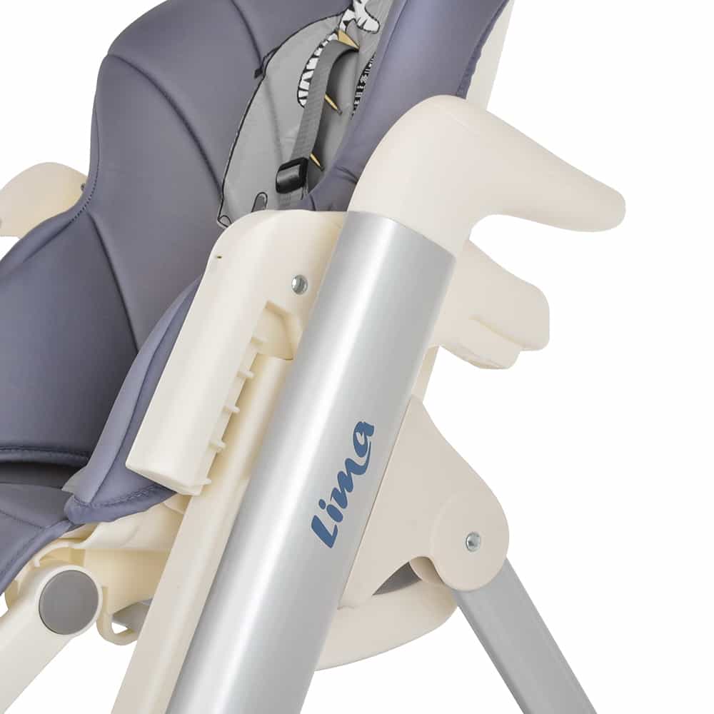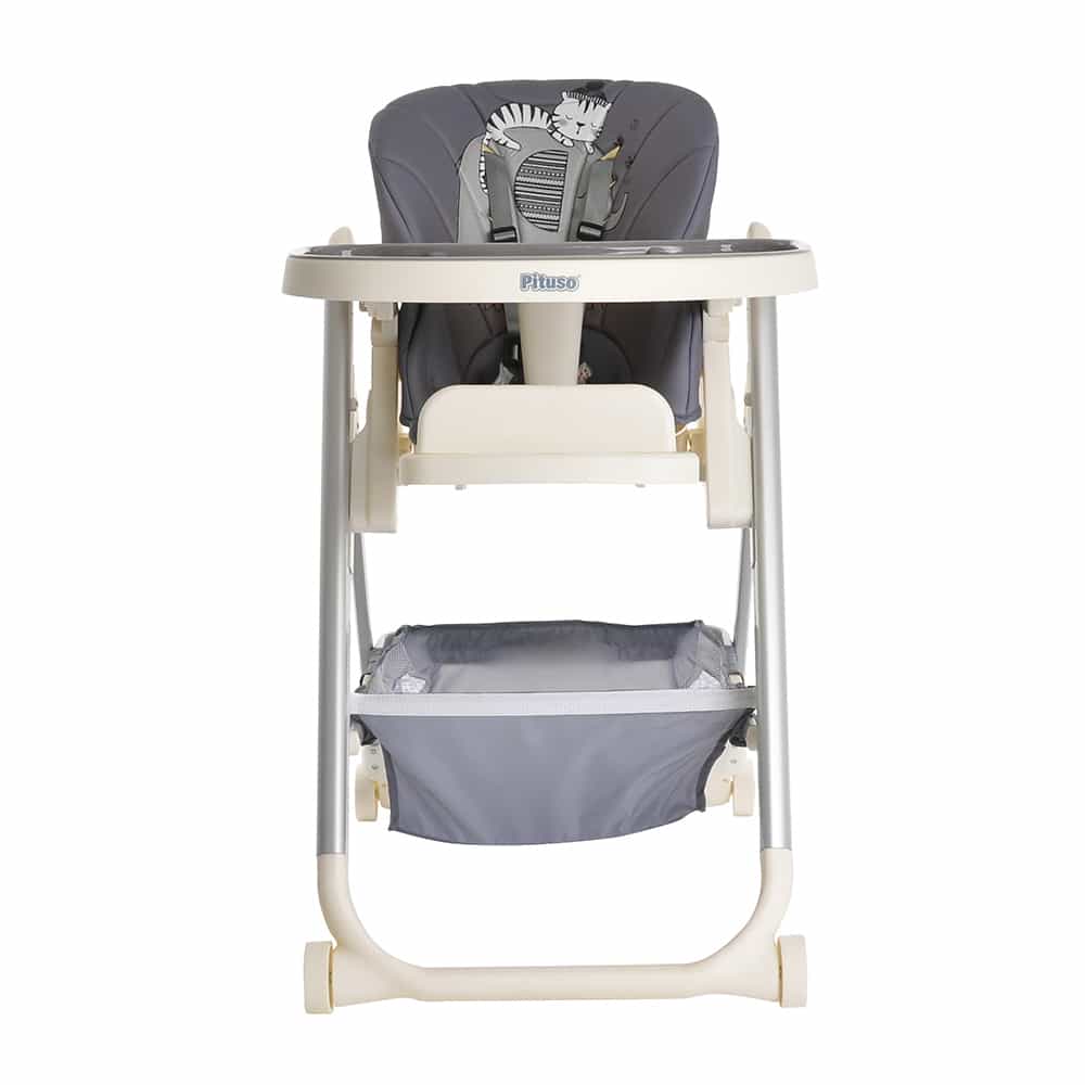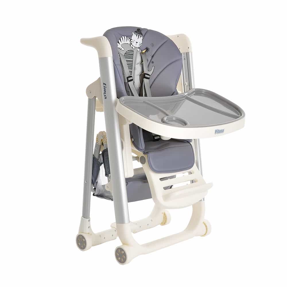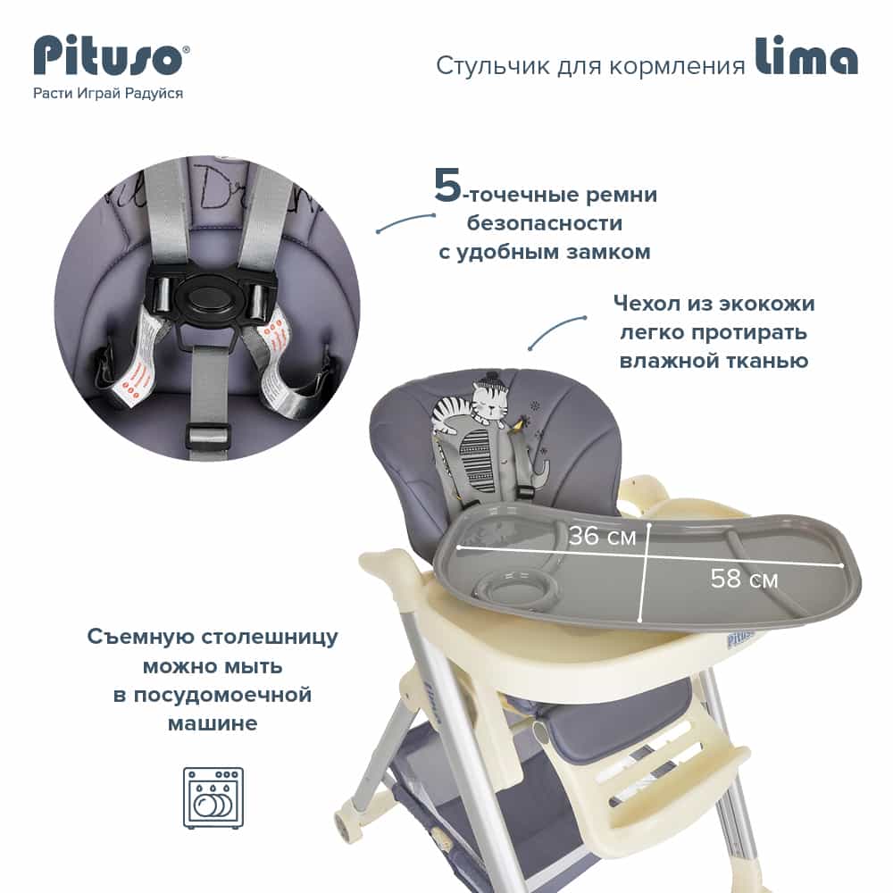 Pituso Lima – надежный, стильный и удобный стульчик для кормления. Алюминиевая рама создает устойчивость и надежность, а задние колесики оснащены педалью тормоза. Безопасная конструкция с мягким сидением из качественной экокожи, легко чистится и компактно складывается. Съемный столик подгоняется в наилучшее положение для кормления, а лоток для приема пищи отлично моется в посудомоечной машине. Пятиточечные страховочные ремни безопасности позволят весело проводить время с малышом, не опасаясь, что он вывалится наружу. Положение шезлонг . В корзину можно положить игрушки, чтобы они всегда были под рукой. Современная эргономичная форма прекрасно впишется в любой интерьер.
