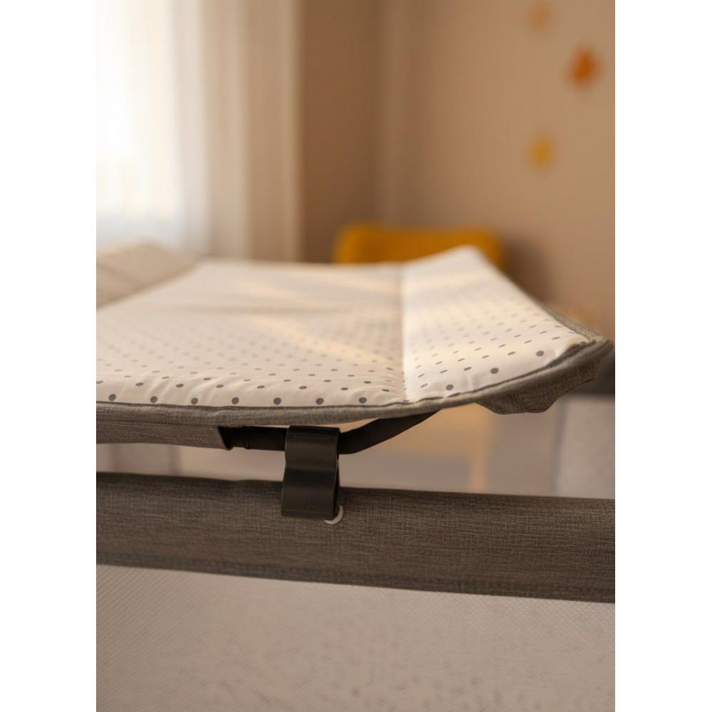 - Пеленальный столик крепится прямо на бортики кроватки, создавая удобное рабочее место для ухода за ребёнком.