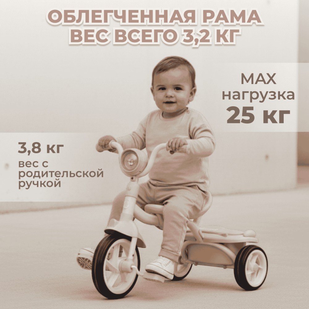 Лёгкий, устойчивый и продуманный до мелочей, он подходит для детей от 1,5 до 3 лет и делает каждую поездку комфортной как для ребёнка, так и для родителей. Благодаря небольшому весу и складной раме велосипед удобно переносить, брать с собой в поездки и хранить дома — он не занимает много места и раскладывается одним движением.