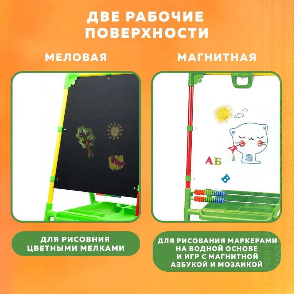 - Две рабочие поверхности: меловая – для рисования мелом; магнитная – для рисования маркерами на водной основе и игр с магнитной азбукой и мозаикой