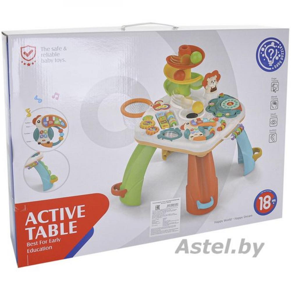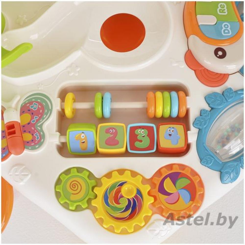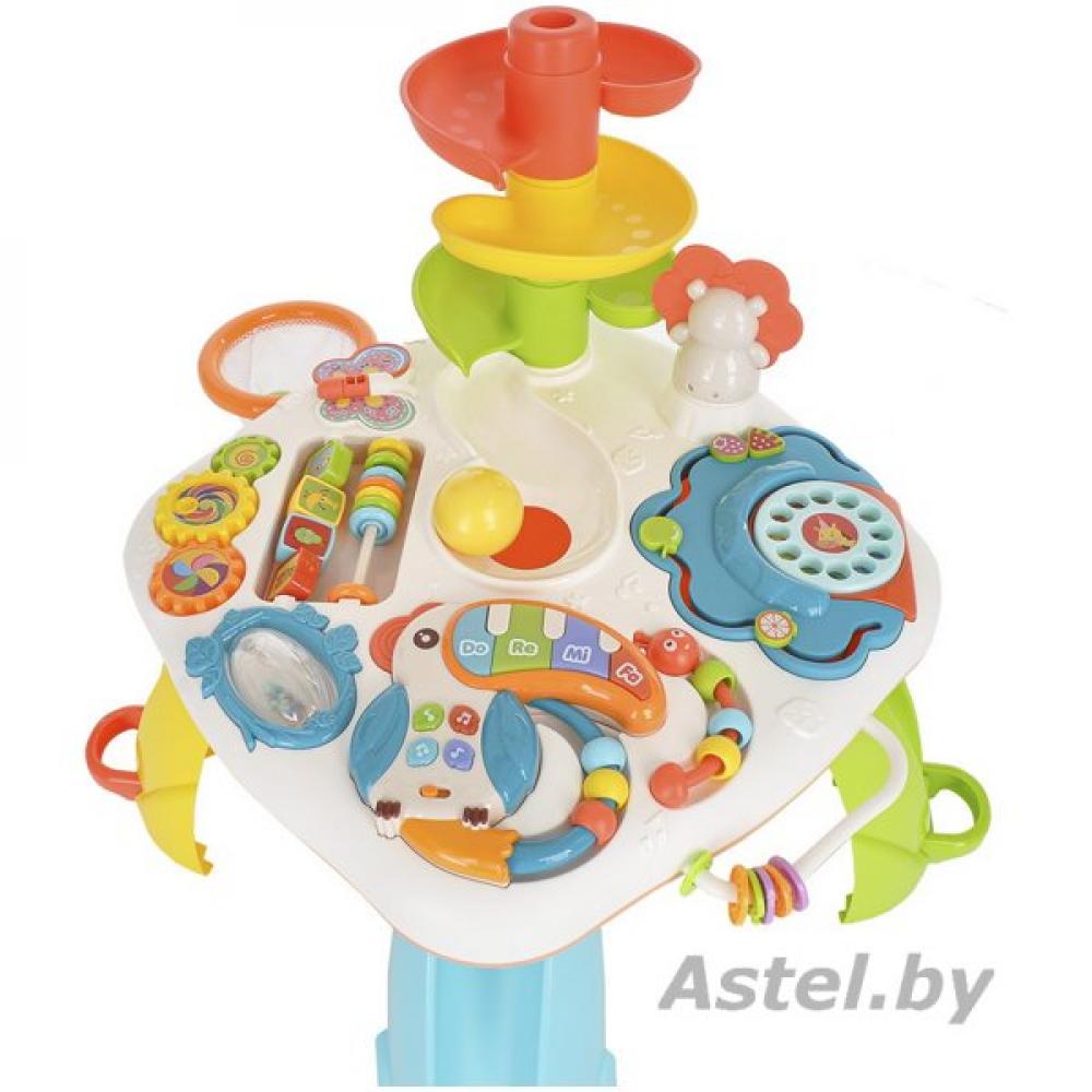 На игровой поверхности имеется музыкальное пианино с разноцветными клавишами, телефон, баскетбольная корзина, горка для шариков, а также различные элементы, которые ребенок может покрутить и нажимать. Игрушку можно использовать как столик. Некоторые элементы – съемные и могут быть использованы по отдельности. Очень удобная музыкальная и многофункциональная панель поможет малышу в развитии.