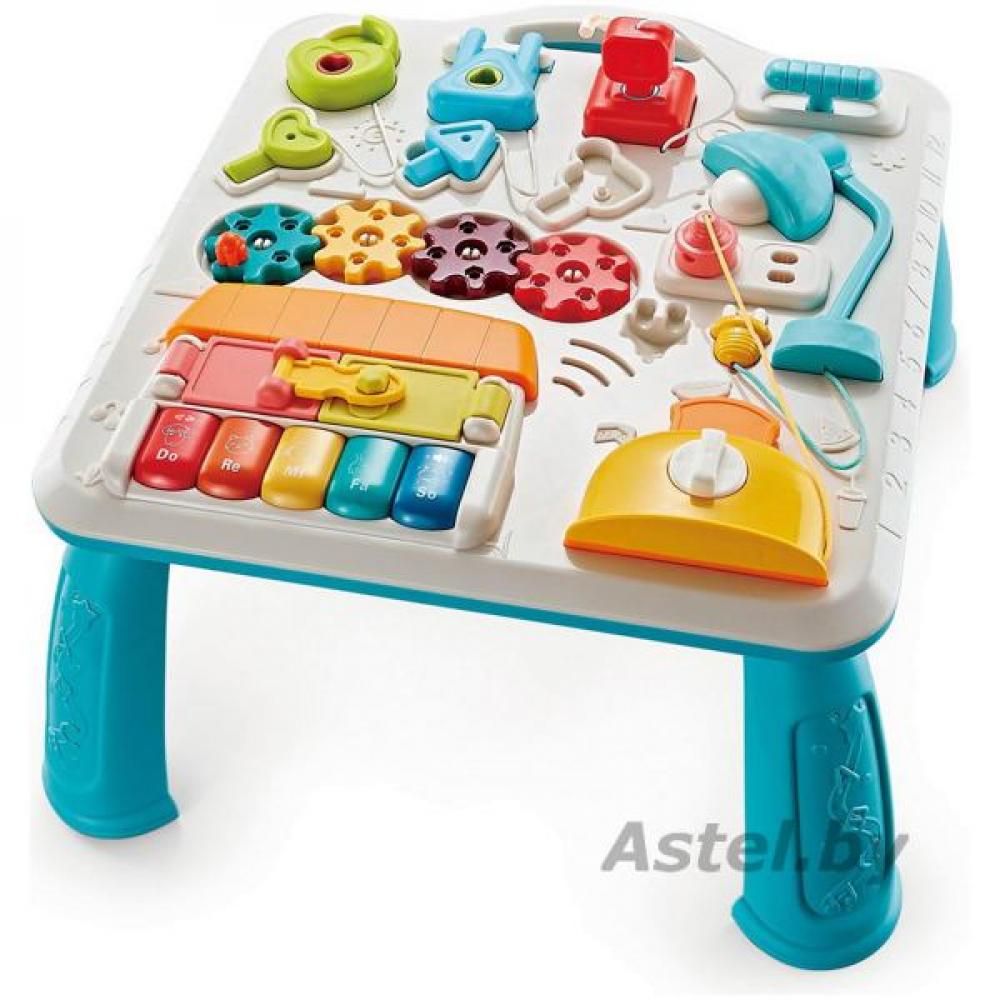 Игрушка развивает моторику рук, память, координацию движений. Размеры столика: 40*36 см, высота на ножках 21 см. Развивающий столик содержит: пианино, крутящиеся шестерёнки, замочки с ключами, книжечку, тостер и лампу (горит свет, когда ребенок вставляет вилку в розетку).