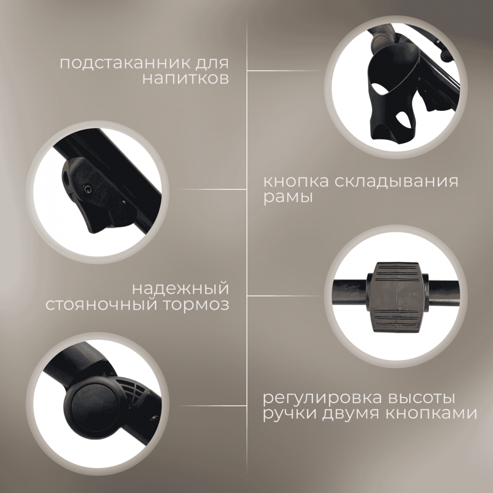 - Регулируемая пружинная амортизация с двумя режимами жёсткости позволяет адаптировать коляску под разные дороги и стиль прогулок.