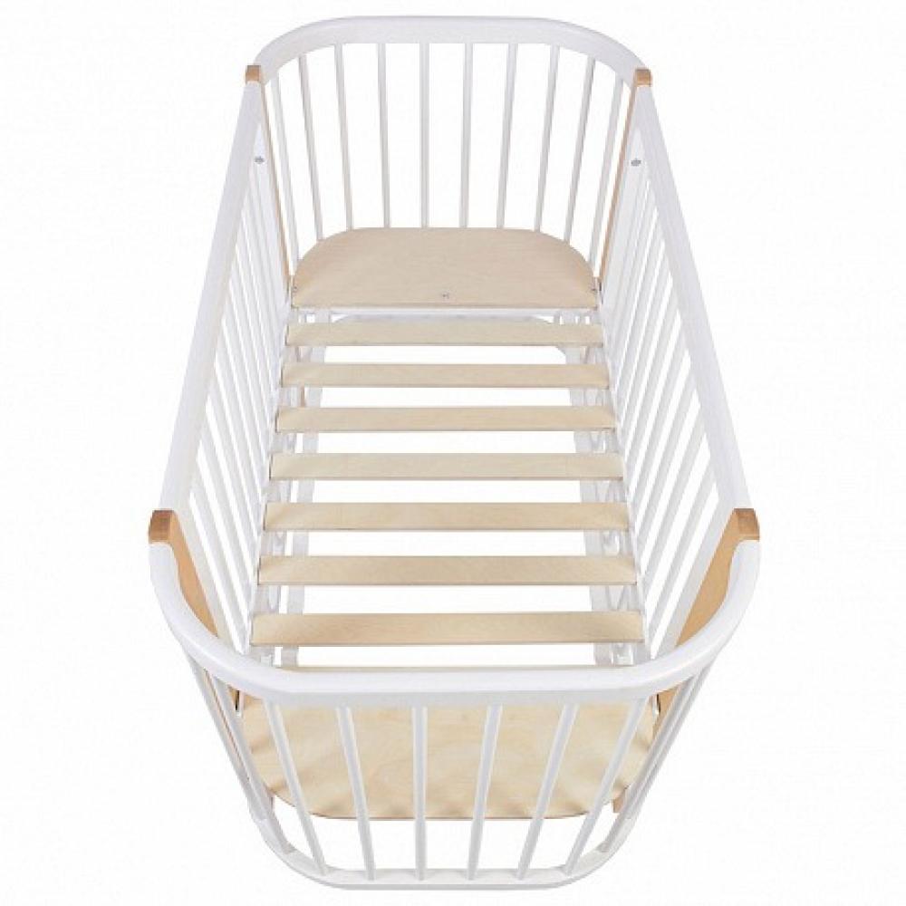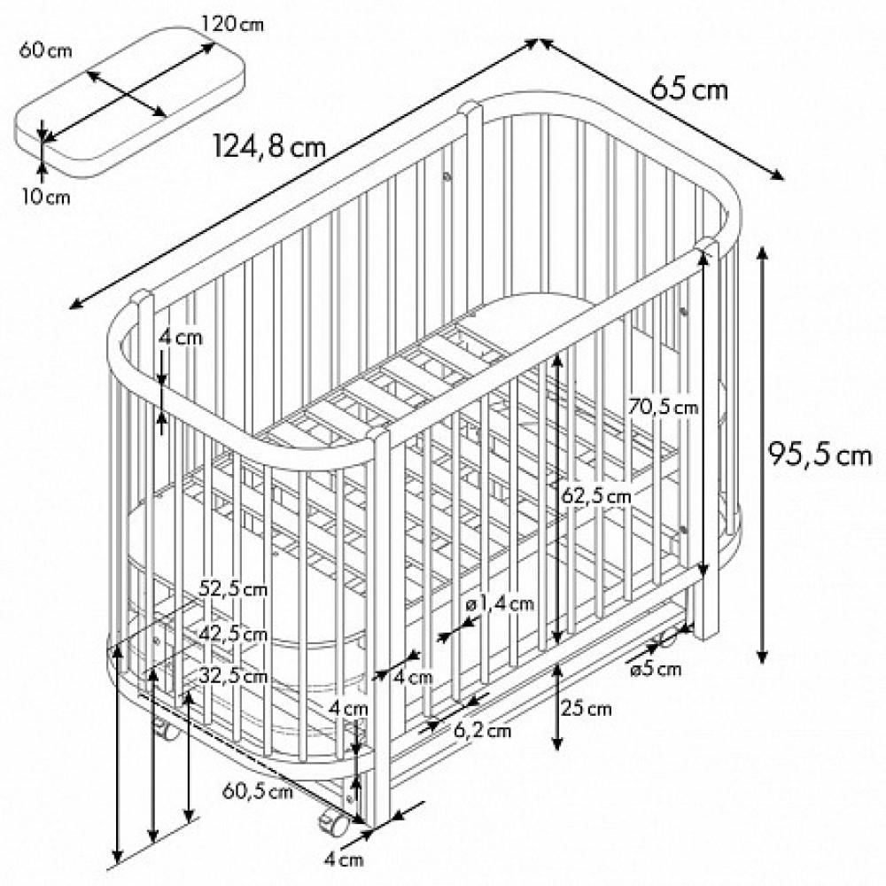 Размер матраса идет стандартный – 120х60 см. Но его отличием для этой модели кроватки будут скругленные углы, полностью повторяющие форму основания. Реечное основание модели, выполненное из фанеры 12 мм и латофлексов 12 мм, создает естественную вентиляцию матраса и обеспечивает правильное формирование позвоночника малыша.