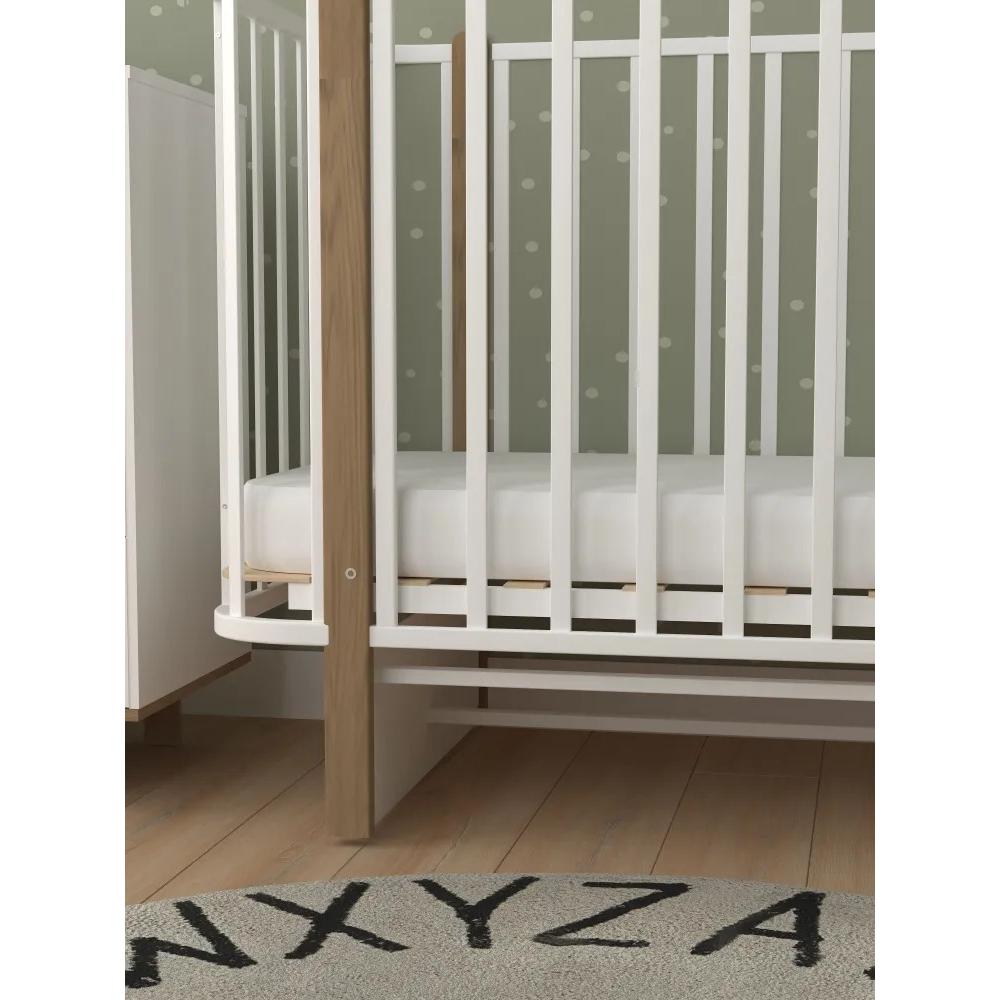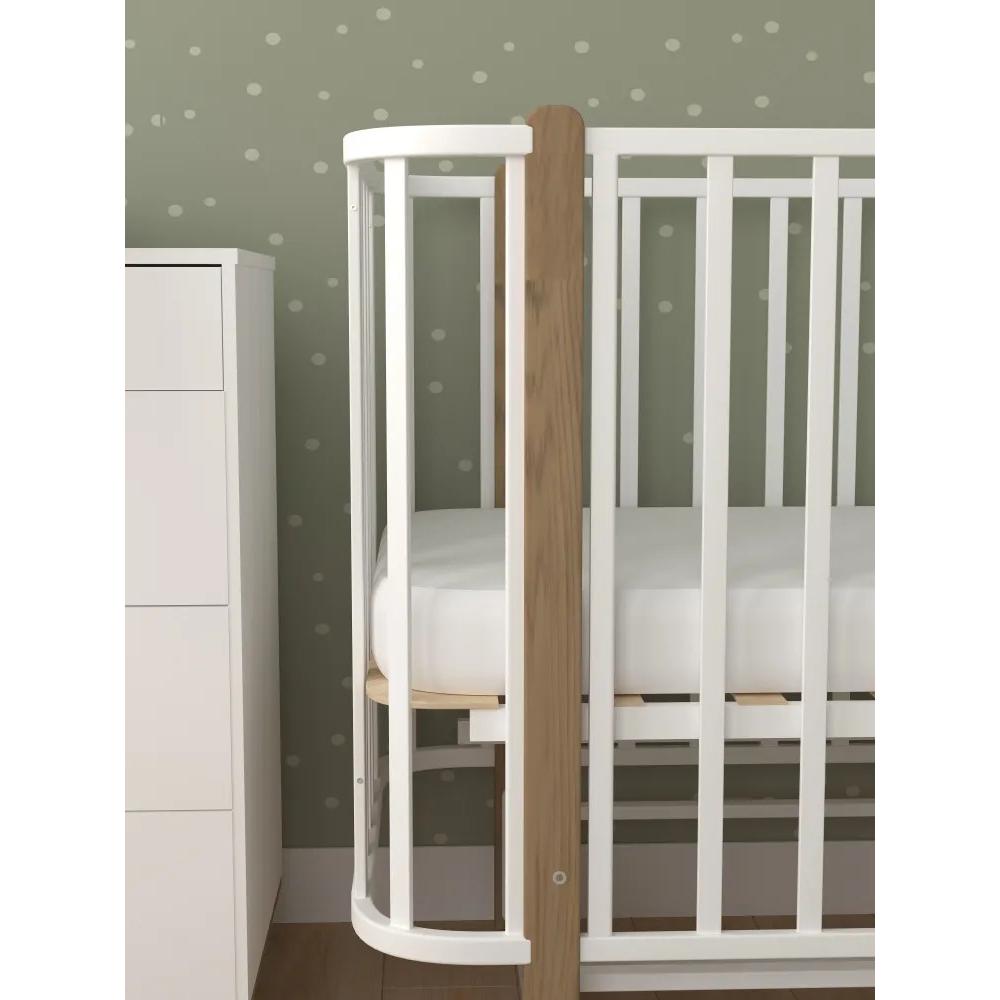 Кроватка имеет съемное переднее ограждение, 5 уровней ложа, цвет белый+бук с маятником (в комплекте продольный и поперечный). Регулировка уровней дна в 5 положениях. Реечное основание. Съемная передняя боковина для возможности приставить кроватки к родительской и организации совместного сна. Можете полностью снять переднюю стенку и прикрепить кроватку к вашей родительской кровати с помощью специального ремня, входящего в комплект.