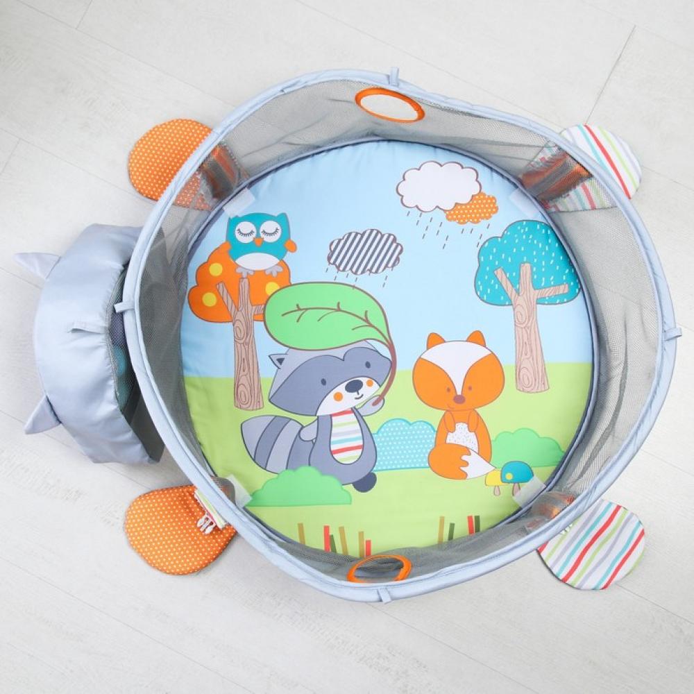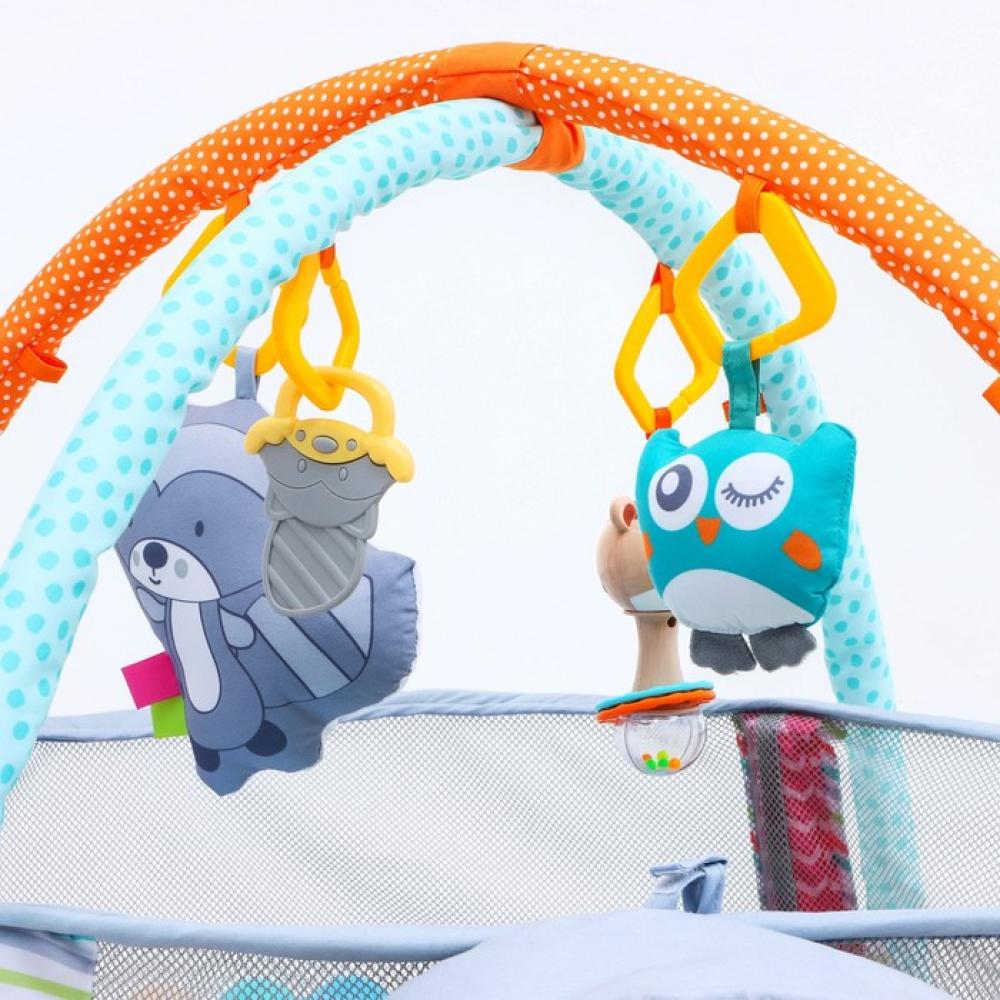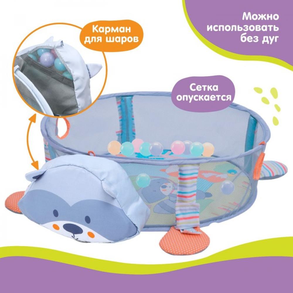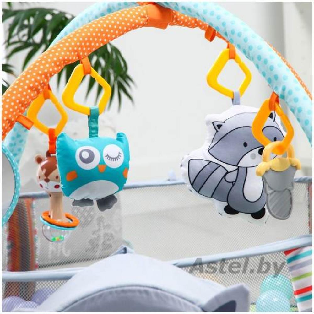 Подвесные игрушки зависят от партии поставки. толщина — около 1.5 см, игровые элементы могут пристегиваться к дугам, а могут служить отдельными погремушками и игрушками, дуга съемная, бортик можно опускать, но не снимать, шарики хранятся в голове у енота, в специальном отсеке,
