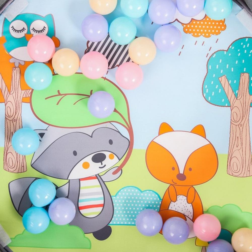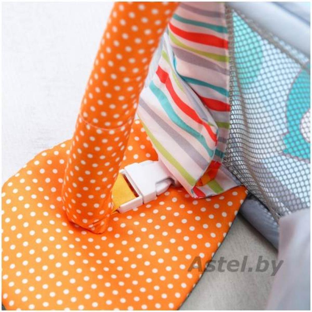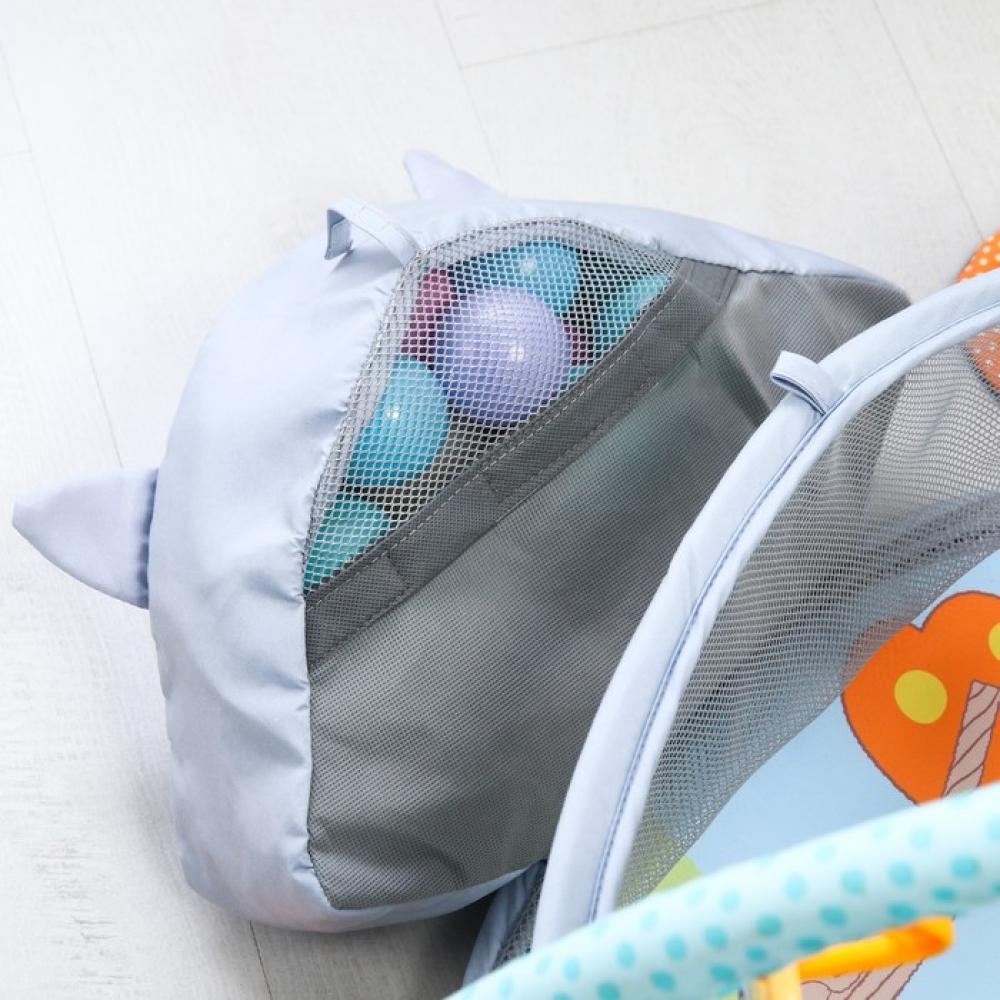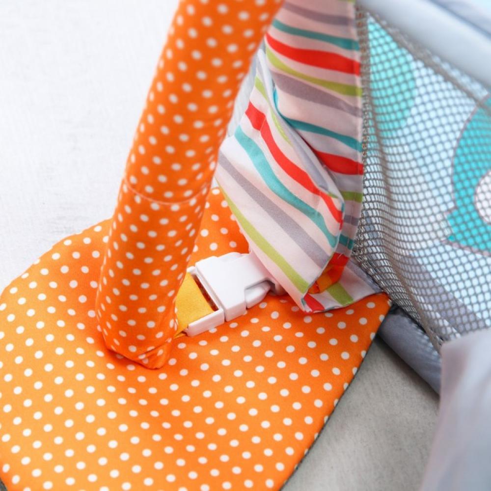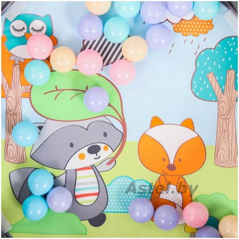 Подвесные игрушки зависят от партии поставки. толщина — около 1.5 см, игровые элементы могут пристегиваться к дугам, а могут служить отдельными погремушками и игрушками, дуга съемная, бортик можно опускать, но не снимать, шарики хранятся в голове у енота, в специальном отсеке,
