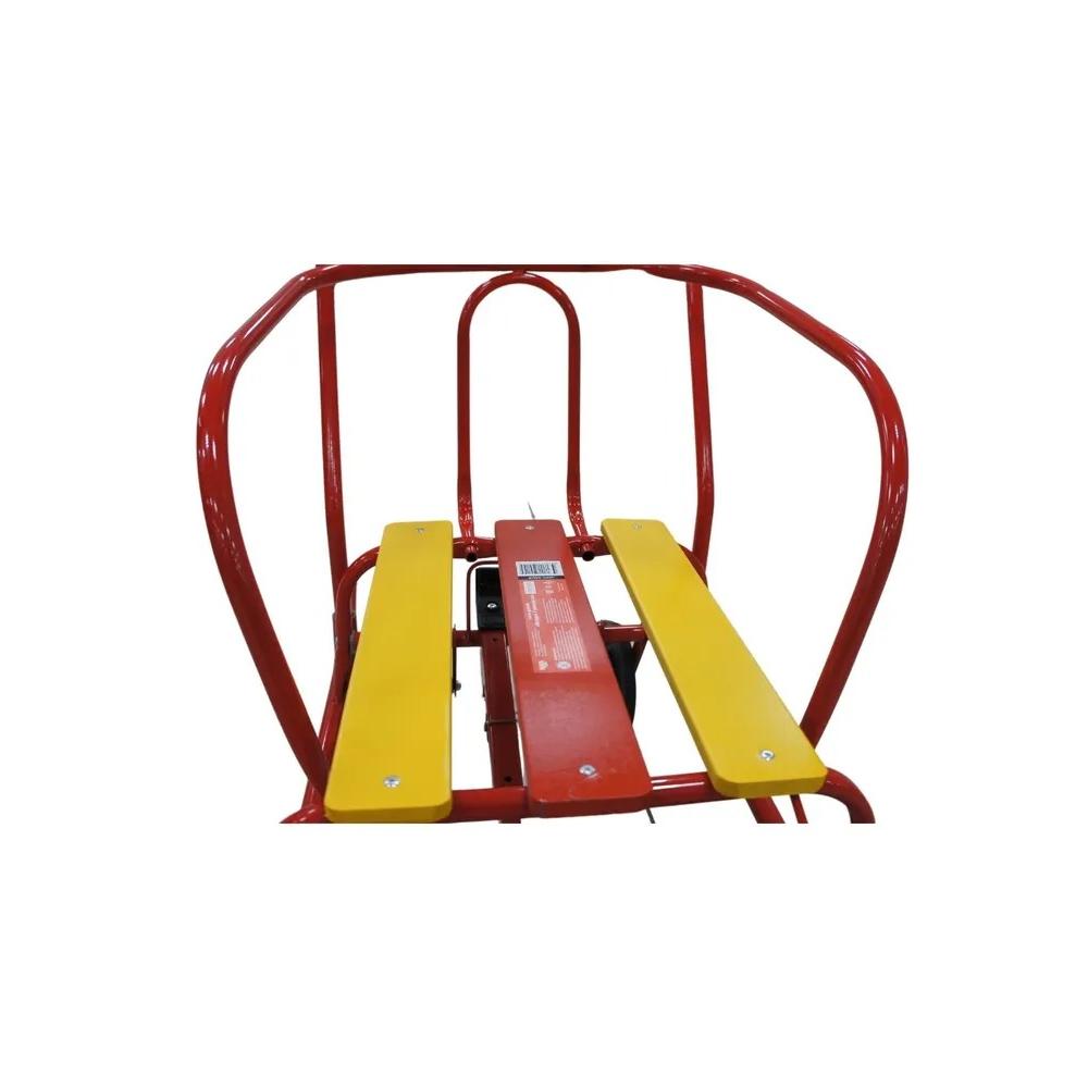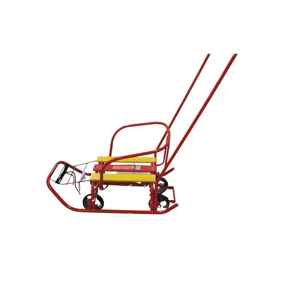 Металлический каркас с антикоррозийным покрытием Механизм выдвижных колёсных шасси Круглые полозья Сиденье - продольная рейка из окрашенного древесного материала Съёмная спинка Ступенчатая подножка Складная родительская ручка-толкатель (2 положения)