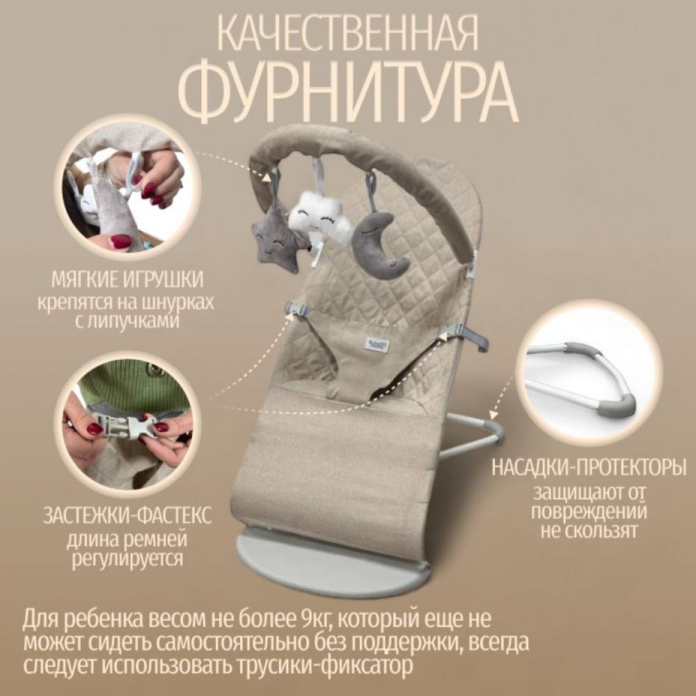Комфорт и безопасность с рождения. Поддержка тела малыша: анатомическая форма сиденья повторяет изгибы позвоночника новорождённого, поддерживает спину и голову в правильном положении, снижает нагрузку на мышцы. Чувство уюта: мягкий дышащий материал создаёт ощущение защищённого пространства, как в маминых объятиях. Надёжная фиксация: устойчивая конструкция предотвращает опрокидывание, а система безопасности в форме «трусиков» удерживает малыша даже при активных движениях.